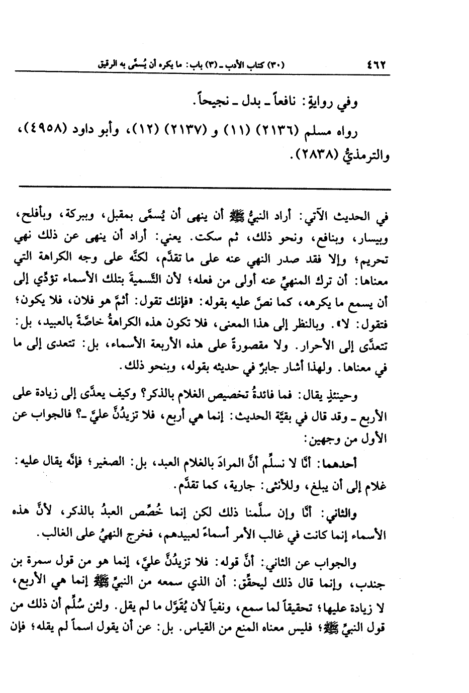 في الحديث الآتي: أراد النبي - صلى الله عليه وسلم - أن ينهى أن يُسمَّى بمقبل، وببركة، وبأفلح، وبيسار، وبنافع، ونحو ذلك، ثم سكت؛ يعني: أراد أن ينهى عن ذلك نهي تحريم، وإلا فقد صدر النهي عنه على ما تقدَّم، لكنه على وجه الكراهة التي معناها: أن ترك المنهي عنه أولى من فعله؛ لأنَّ التَّسمية بتلك الأسماء تؤدي إلى أن يسمع ما يكرهه، كما نصَّ عليه بقوله: (فإنك تقول: أثمَّ هو فلان، فلا يكون؛ فتقول: لا) وبالنظر إلى هذا المعنى، فلا تكون هذه الكراهة خاصة بالعبيد، بل: تتعدى إلى الأحرار. ولا مقصورة على هذه الأربعة الأسماء، بل: تتعدى إلى ما في معناها. ولهذا أشار جابر في حديثه بقوله، وبنحو ذلك.