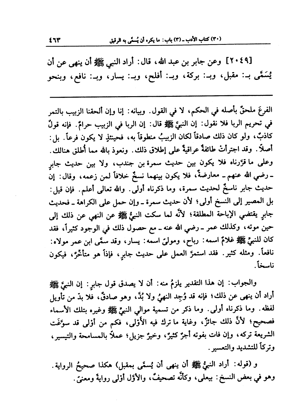 [2049] وعن جَابِرَ بنَ عَبدِ اللَّهِ قال: أَرَادَ النَّبِيُّ صَلَّى اللَّهُ عَلَيهِ وَسَلَّمَ أَن يَنهَى عَن أَن يُسَمَّى بِمقبل وَبِبَرَكَةَ وَبِأَفلَحَ وَبِيَسَارٍ وَبِنَافِعٍ وَبِنَحوِ
