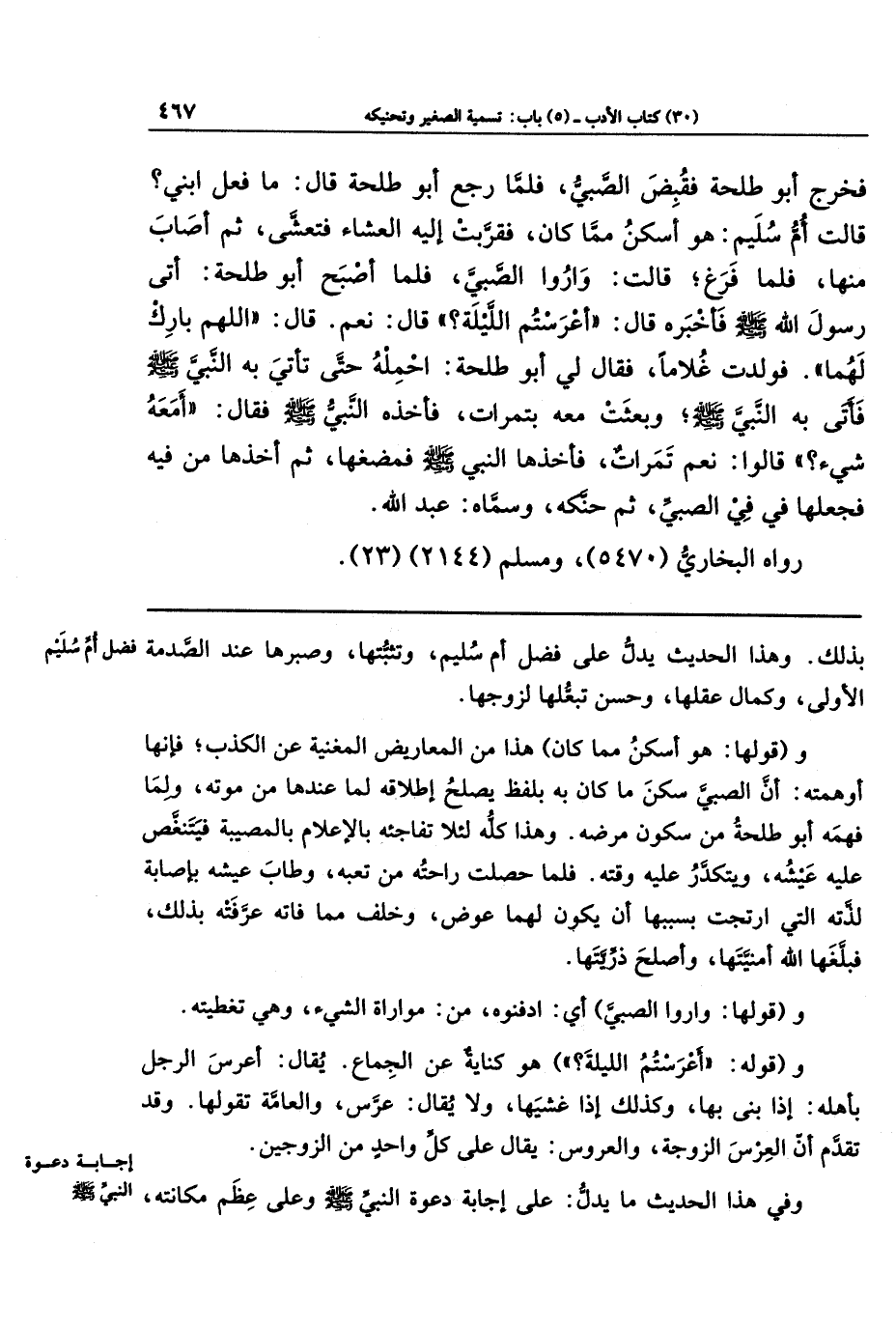 فَخَرَجَ أَبُو طَلحَةَ فَقُبِضَ الصَّبِيُّ، فَلَمَّا رَجَعَ أَبُو طَلحَةَ قَالَ: مَا فَعَلَ ابنِي؟ قَالَت أُمُّ سُلَيمٍ: هُوَ أَسكَنُ مِمَّا كَانَ، فَقَرَّبَت إِلَيهِ العَشَاءَ فَتَعَشَّى، ثُمَّ أَصَابَ مِنهَا، فَلَمَّا فَرَغَ قَالَت: وَارُوا الصَّبِيَّ، فَلَمَّا أَصبَحَ أَبُو طَلحَةَ أَتَى رَسُولَ اللَّهِ صَلَّى اللَّهُ عَلَيهِ وَسَلَّمَ فَأَخبَرَهُ قَالَ: أَعرَستُم اللَّيلَةَ؟ قَالَ: نَعَم. قَالَ: اللَّهُمَّ بَارِك لَهُمَا. فَوَلَدَت غُلَامًا، فَقَالَ لِي أَبُو طَلحَةَ: احمِلهُ حَتَّى تَأتِيَ بِهِ النَّبِيَّ صَلَّى اللهُ عَلَيهِ وَسَلَّمَ، فَأَتَى بِهِ النَّبِيَّ صَلَّى اللَّهُ عَلَيهِ وَسَلَّمَ وَبَعَثَت مَعَهُ بِتَمَرَاتٍ، فَأَخَذَهُ النَّبِيُّ صَلَّى اللَّهُ عَلَيهِ وَسَلَّمَ فَقَالَ: أَمَعَهُ شَيءٌ؟ قَالَوا: نَعَم، تَمَرَاتٌ. فَأَخَذَهَا النَّبِيُّ صَلَّى اللَّهُ عَلَيهِ وَسَلَّمَ فَمَضَغَهَا، ثُمَّ أَخَذَهَا مِن فِيهِ فَجَعَلَهَا فِي فِيِّ الصَّبِيِّ، ثُمَّ حَنَّكَهُ وَسَمَّاهُ عَبدَ اللَّهِ.
