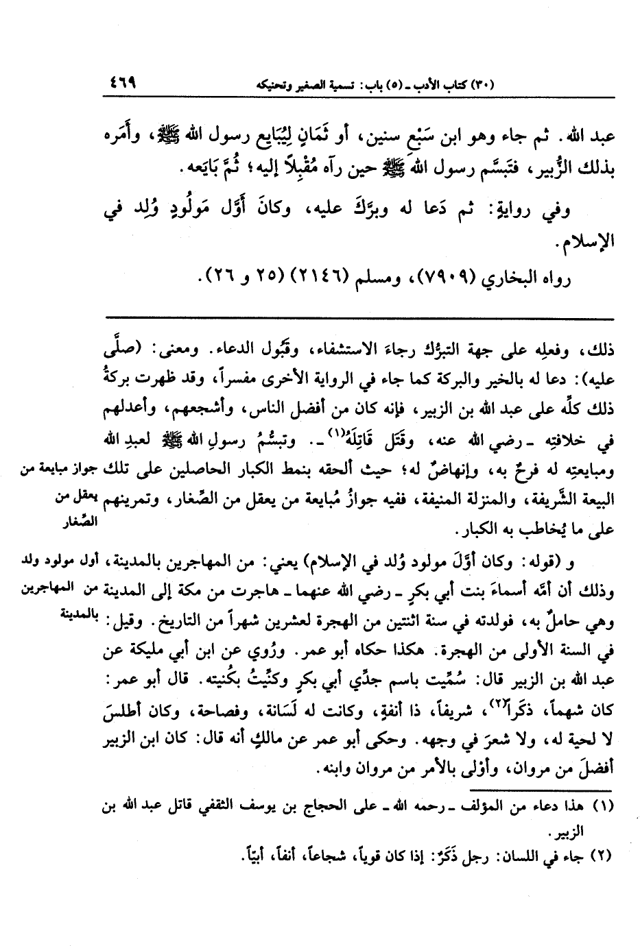 وفي رواية: ثُمَّ دَعَا لَهُ وَبَرَّكَ عَلَيهِ، وَكَانَ أَوَّلَ مَولُودٍ وُلِدَ فِي الإِسلَامِ.
