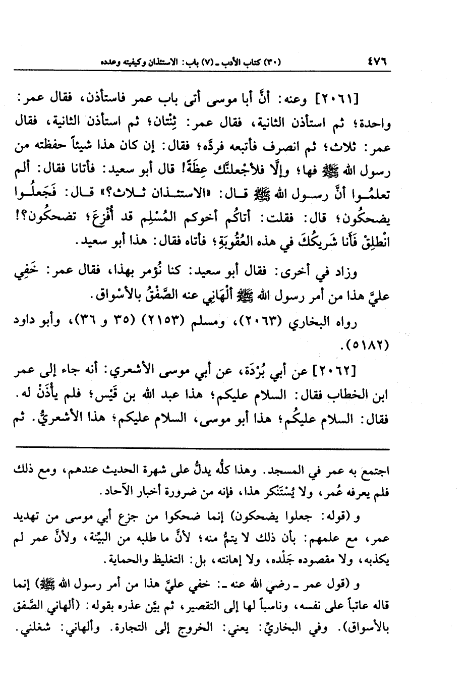 [2061] وعنه أَنَّ أَبَا مُوسَى أَتَى بَابَ عُمَرَ فَاستَأذَنَ، فَقَالَ عُمَرُ: وَاحِدَةٌ، ثُمَّ استَأذَنَ الثَّانِيَةَ، فَقَالَ عُمَرُ: ثِنتَانِ، ثُمَّ استَأذَنَ الثَّانية فَقَالَ عُمَرُ: ثَلَاثٌ، ثُمَّ انصَرَفَ فَأَتبَعَهُ فَرَدَّهُ فَقَالَ: إِن كَانَ هَذَا شَيئًا حَفِظتَهُ مِن رَسُولِ اللَّهِ صَلَّى اللَّهُ عَلَيهِ وَسَلَّمَ فَهَا، وَإِلَّا فَلَأَجعَلَنَّكَ عِظَةً. قَالَ أَبُو سَعِيدٍ: فَأَتَانَا فَقَالَ: أَلَم تَعلَمُوا أَنَّ رَسُولَ اللَّهِ صَلَّى اللَّهُ عَلَيهِ وَسَلَّمَ قَالَ: الِاستِئذَانُ ثَلَاثٌ؟ . قَالَ: فَجَعَلُوا يَضحَكُونَ. قَالَ: فَقُلتُ: أَتَاكُم أَخُوكُم المُسلِمُ قَد أُفزِعَ، تَضحَكُونَ؟ ! انطَلِق فَأَنَا شَرِيكُكَ فِي هَذِهِ العُقُوبَةِ، فَأَتَاهُ فَقَالَ: هَذَا أَبُو سَعِيدٍ.