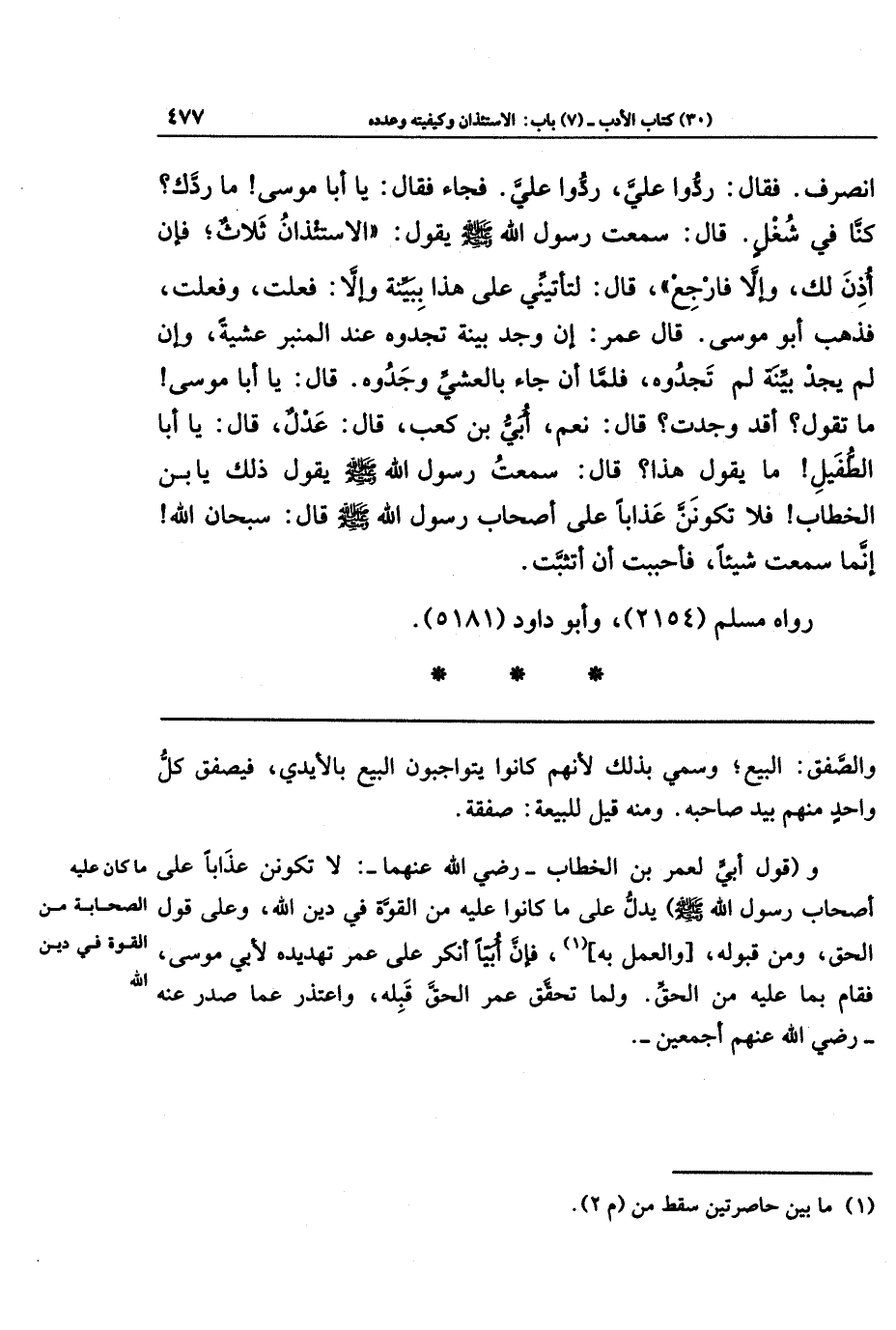 انصَرَفَ فَقَالَ: رُدُّوا عَلَيَّ، رُدُّوا عَلَيَّ، فَجَاءَ فَقَالَ: يَا أَبَا مُوسَى، مَا رَدَّكَ؟ كُنَّا فِي شُغلٍ. قَالَ: سَمِعتُ رَسُولَ اللَّهِ صَلَّى اللَّهُ عَلَيهِ وَسَلَّمَ يَقُولُ: الِاستِئذَانُ ثَلَاثٌ، فَإِن أُذِنَ لَكَ وَإِلَّا فَارجِع، قَالَ: لَتَأتِيَنِّي عَلَى هَذَا بِبَيِّنَةٍ، وَإِلَّا فَعَلتُ وَفَعَلتُ. فَذَهَبَ أَبُو مُوسَى، قَالَ عُمَرُ: إِن وَجَدَ بَيِّنَةً تَجِدُوهُ عِندَ المِنبَرِ عَشِيَّةً، وَإِن لَم يَجِد بَيِّنَةً لَم تَجِدُوهُ. فَلَمَّا أَن جَاءَ بِالعَشِيِّ وَجَدُوهُ قَالَ: يَا أَبَا مُوسَى، مَا تَقُولُ؟ أَقَد وَجَدتَ؟ قَالَ: نَعَم، أُبَيَّ بنَ كَعبٍ. قَالَ: عَدلٌ. قَالَ: يَا أَبَا الطُّفَيلِ، مَا يَقُولُ هَذَا؟ قَالَ: سَمِعتُ رَسُولَ اللَّهِ صَلَّى اللَّهُ عَلَيهِ وَسَلَّمَ يَقُولُ ذَلِكَ يَا بنَ الخَطَّابِ، فَلَا تَكُونَنَّ عَذَابًا عَلَى أَصحَابِ رَسُولِ اللَّهِ صَلَّى اللهُ عَلَيهِ وَسَلَّمَ. قَالَ: سُبحَانَ اللَّهِ، إِنَّمَا سَمِعتُ شَيئًا، فَأَحبَبتُ أَن أَتَثَبَّتَ.