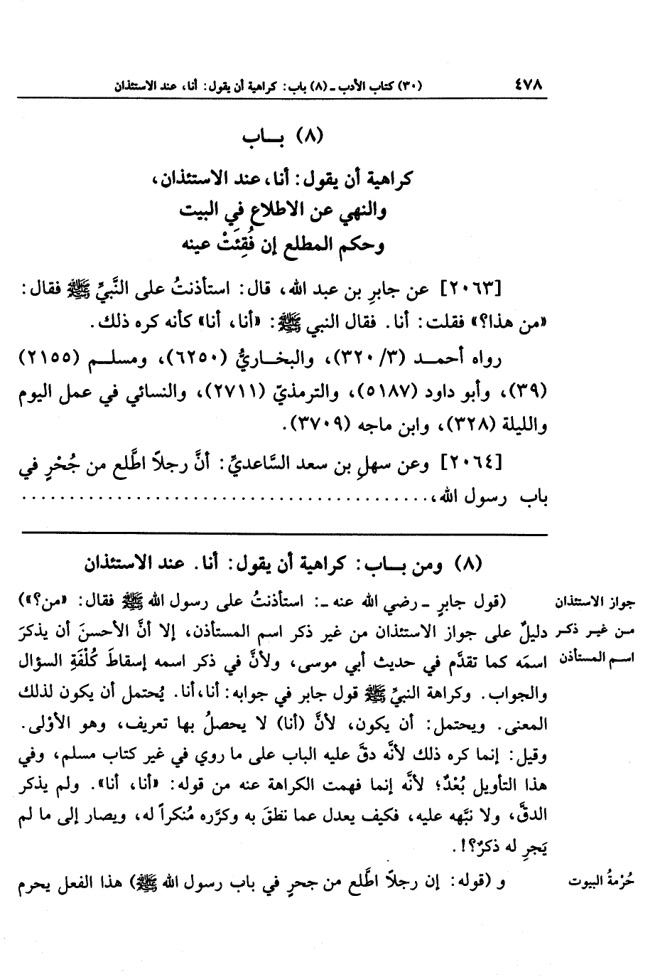 [2063] عَن جَابِرِ بنِ عَبدِ اللَّهِ قَالَ: استَأذَنتُ عَلَى النَّبِيِّ صَلَّى اللَّهُ عَلَيهِ وَسَلَّمَ فَقَالَ: مَن هَذَا؟ فَقُلتُ: أَنَا. فَقَالَ النَّبِيُّ صَلَّى اللهُ عَلَيهِ وَسَلَّمَ: أَنَا، أَنَا. كَأَنَّهُ كَرِهَ ذَلِكَ.