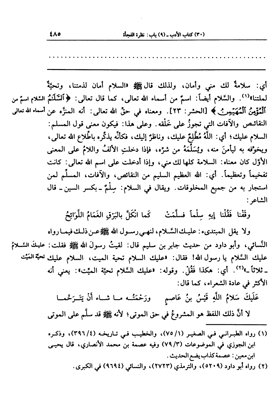 ولا يقل المبتدئ: عليك السَّلام، لنهي رسول الله - صلى الله عليه وسلم - عن ذلك فيما رواه النِّسائي، وأبو داود من حديث جابر بن سليم قال: لقيت رسول الله صلى الله عليه وسلم فقلت: عليك السَّلام، يا رسول الله! فقال: (عليك السلام تحية الميت، السلام عليك - ثلاثا -) (¬2) أي: هكذا فقل.