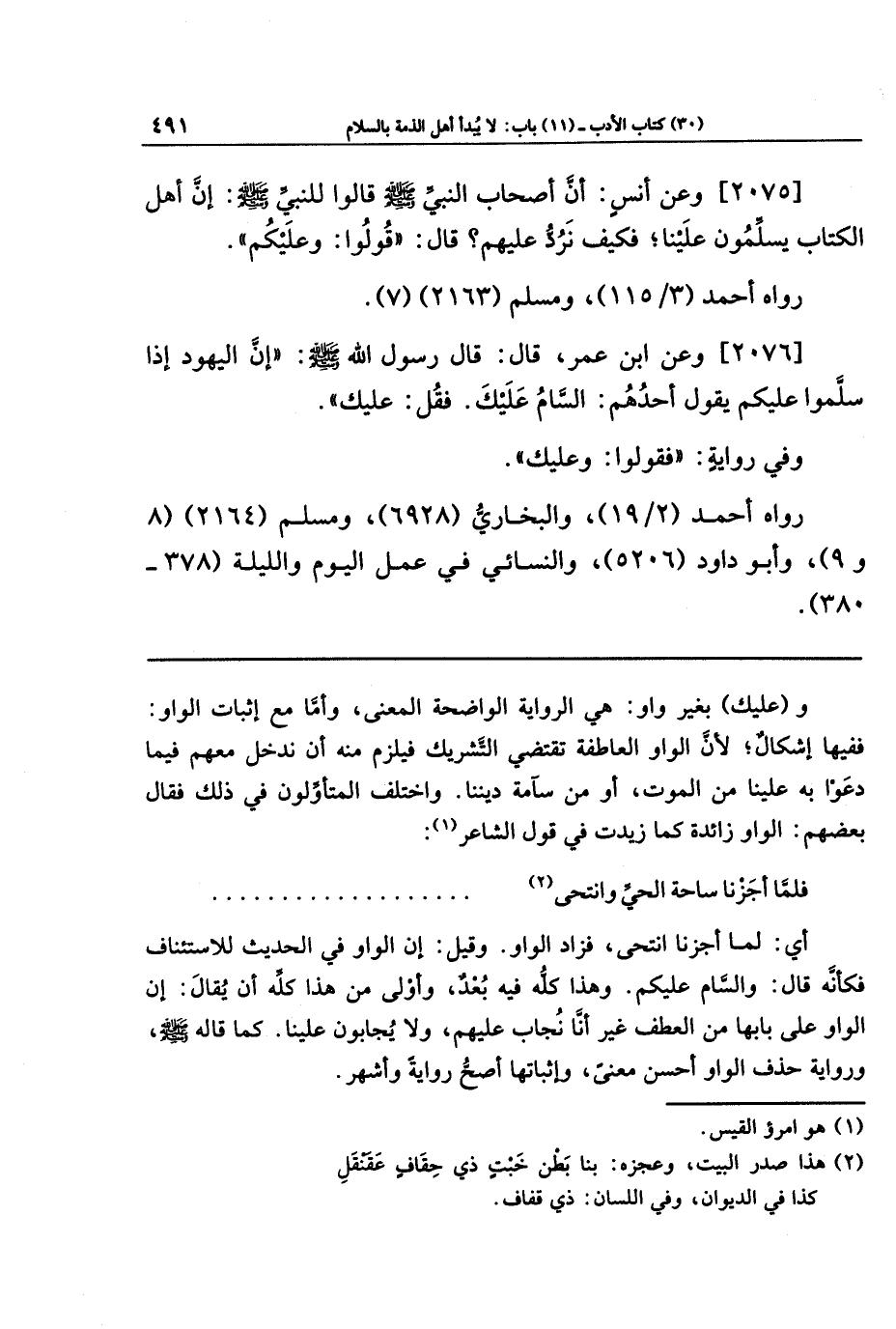 [2075] وعَن أَنَسٍ: أَنَّ أَصحَابَ النَّبِيِّ صَلَّى اللَّهُ عَلَيهِ وَسَلَّمَ قَالُوا لِلنَّبِيِّ صَلَّى اللَّهُ عَلَيهِ وَسَلَّمَ: إِنَّ أَهلَ الكِتَابِ يُسَلِّمُونَ عَلَينَا، فَكَيفَ نَرُدُّ عَلَيهِم؟ قَالَ: قُولُوا: وَعَلَيكُم.