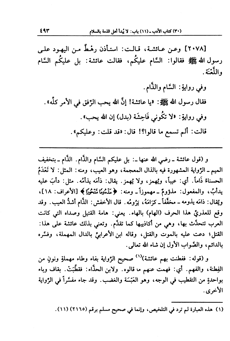 [2078] وعَن عَائِشَةَ قَالَت: استَأذَنَ رَهطٌ مِن اليَهُودِ عَلَى رَسُولِ اللَّهِ صَلَّى اللَّهُ عَلَيهِ وَسَلَّمَ، فَقَالُوا: السَّامُ عَلَيكُم، فَقَالَت عَائِشَةُ: بَل عَلَيكُم السَّامُ وَاللَّعنَةُ.