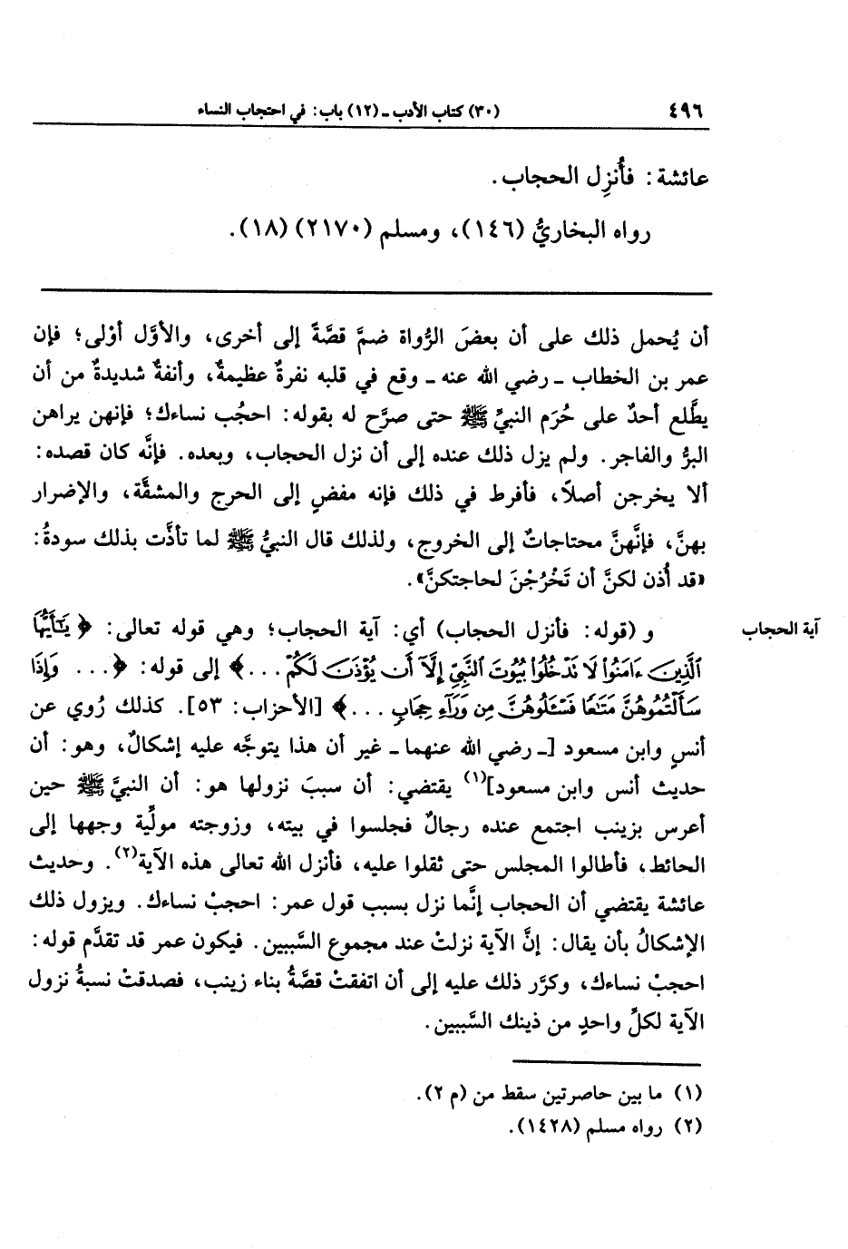 و(قوله: فأنزل الحجاب) أي: آية الحجاب؛ وهي قوله تعالى: {يَا أَيُّهَا الَّذِينَ آمَنُوا لا تَدخُلُوا بُيُوتَ النَّبِيِّ إِلا أَن يُؤذَنَ لَكُم} إلى قوله: {وَإِذَا سَأَلتُمُوهُنَّ مَتَاعًا فَاسأَلُوهُنَّ مِن وَرَاءِ حِجَابٍ} كذلك روي عن أنس وابن مسعود - رضي الله عنهما -؛ غير أن هذا يتوجَّه عليه إشكال، وهو: أن حديث أنس وابن مسعود (¬1) يقتضي: أن سبب نزولها هو: أن النبي - صلى الله عليه وسلم - حين أعرس بزينب اجتمع عنده رجال فجلسوا في بيته، وزوجته مولية وجهها إلى الحائط، فأطالوا المجلس حتى ثقلوا عليه، فأنزل الله تعالى هذه الآية (¬2). وحديث عائشة يقتضي أن الحجاب إنَّما نزل بسبب قول عمر: احجب نساءك. ويزول ذلك الإشكال بأن يقال: إن الآية نزلت عند مجموع السَّببين. فيكون عمر قد تقدَّم قوله: احجب نساءك، وكرر ذلك عليه إلى أن اتفقت قصة بناء زينب، فصدقت نسبة نزول الآية لكل واحد من ذينك السَّببين.