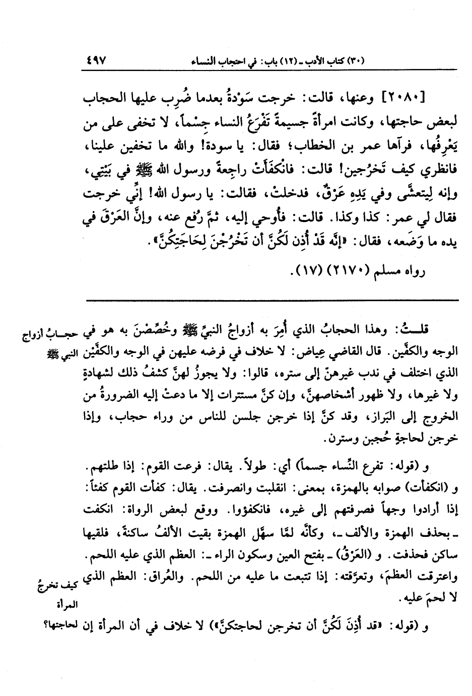 [2080] وعنها قَالَت: خَرَجَت سَودَةُ، بَعدَمَا ضُرِبَ عَلَيهَا الحِجَابُ، لِبعض حَاجَتَهَا، وَكَانَت امرَأَةً جَسِيمَةً تَفرَعُ النِّسَاءَ جِسمًا، لَا تَخفَى عَلَى مَن يَعرِفُهَا، فَرَآهَا عُمَرُ بنُ الخَطَّابِ، فَقَالَ: يَا سَودَةُ! وَاللَّهِ مَا تَخفَينَ عَلَينَا، فَانظُرِي كَيفَ تَخرُجِينَ، قَالَت: فَانكَفَأَت رَاجِعَةً وَرَسُولُ اللَّهِ صَلَّى اللَّهُ عَلَيهِ وَسَلَّمَ فِي بَيتِي، وَإِنَّهُ لَيَتَعَشَّى وَفِي يَدِهِ عَرقٌ، فَدَخَلَت فَقَالَت: يَا رَسُولَ اللَّهِ، إِنِّي خَرَجتُ، فَقَالَ لِي عُمَرُ: كَذَا وَكَذَا، قَالَت: فَأُوحِيَ إِلَيهِ، ثُمَّ رُفِعَ عَنهُ، وَإِنَّ العَرقَ فِي يَدِهِ مَا وَضَعَهُ، فَقَالَ: إِنَّهُ قَد أُذِنَ لَكُنَّ أَن تَخرُجنَ لِحَاجَتِكُنَّ.