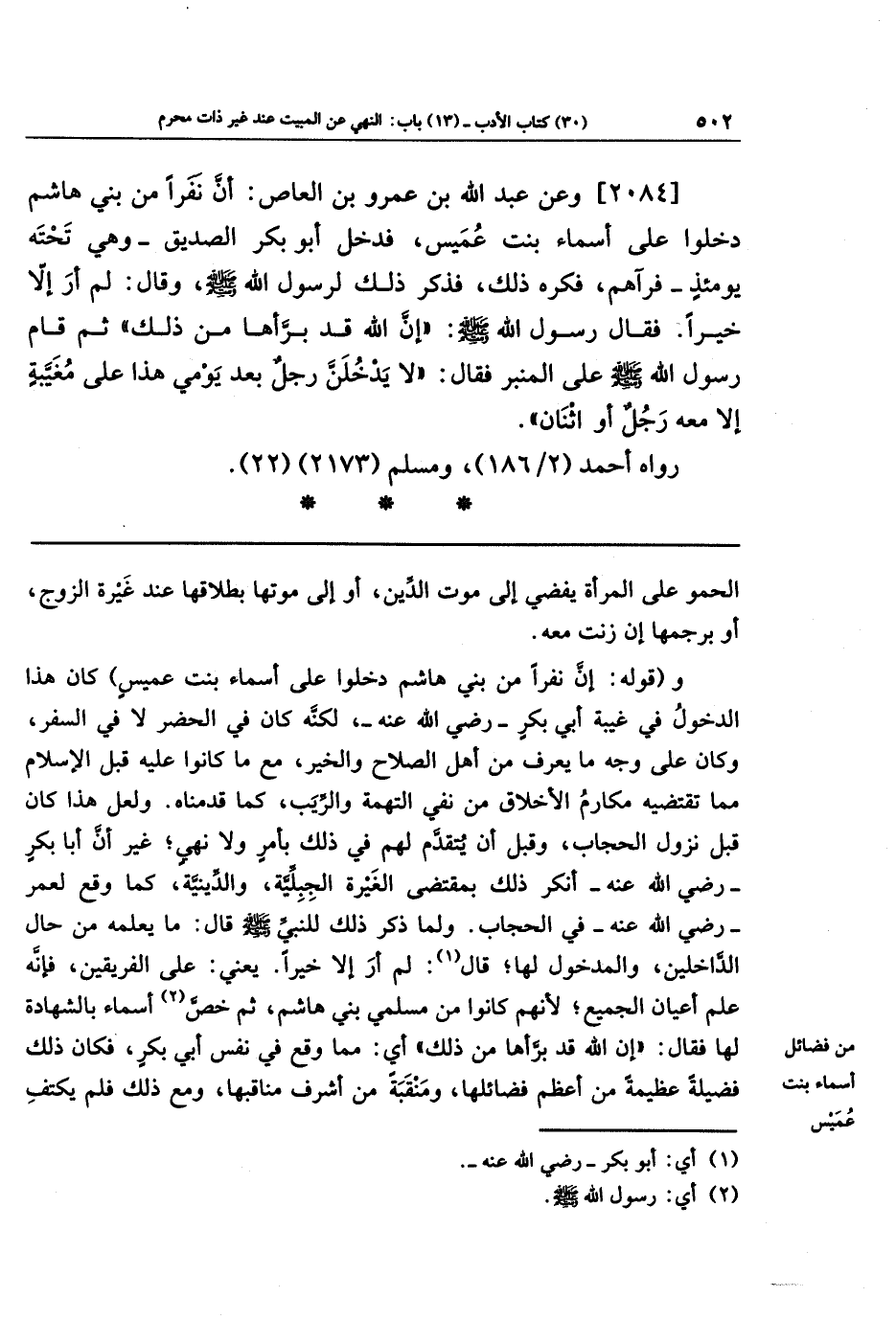 [2084] وعن عَبدَ اللَّهِ بنَ عَمرِو بنِ العَاصِ: أَنَّ نَفَرًا مِن بَنِي هَاشِمٍ دَخَلُوا عَلَى أَسمَاءَ بِنتِ عُمَيسٍ، فَدَخَلَ أَبُو بَكرٍ الصِّدِّيقُ، وَهِيَ تَحتَهُ يَومَئِذٍ، فَرَآهُم، فَكَرِهَ ذَلِكَ، فَذَكَرَ ذَلِكَ لِرَسُولِ اللَّهِ صَلَّى اللَّهُ عَلَيهِ وَسَلَّمَ وَقَالَ: لَم أَرَ إِلَّا خَيرًا، فَقَالَ رَسُولُ اللَّهِ صَلَّى اللَّهُ عَلَيهِ وَسَلَّمَ: إِنَّ اللَّهَ قَد بَرَّأَهَا مِن ذَلِكَ، ثُمَّ قَامَ رَسُولُ اللَّهِ صَلَّى اللَّهُ عَلَيهِ وَسَلَّمَ عَلَى المِنبَرِ فَقَالَ: لَا يَدخُلَنَّ رَجُلٌ بَعدَ يَومِي هَذَا، عَلَى مُغِيبَةٍ، إِلَّا مَعَهُ رَجُلٌ أَو اثنَانِ.