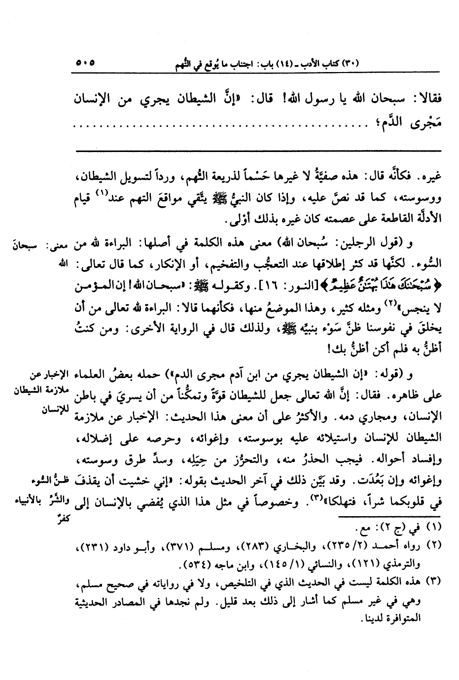 فَقَالَا: سُبحَانَ اللَّهِ! يَا رَسُولَ اللَّهِ! قَالَ: إِنَّ الشَّيطَانَ يَجرِي مِن الإِنسَانِ مَجرَى الدَّمِ،