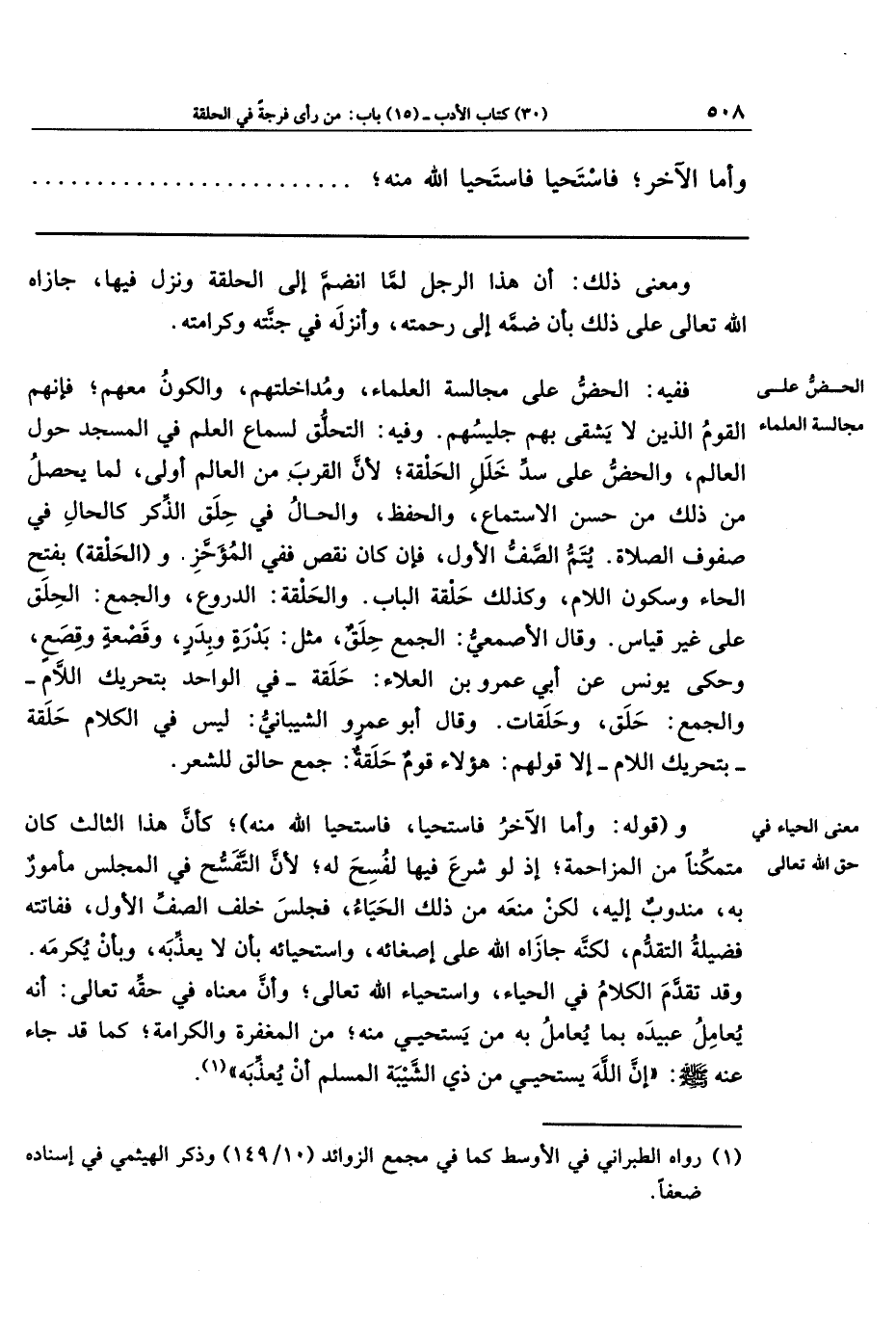 وفيه: التحلق لسماع العلم في المسجد حول العالم، والحضُّ على سدِّ خلل الحلقة؛ لأنَّ القرب من العالم أولى، لما يحصل من ذلك من حسن الاستماع، والحفظ، والحال في حلق الذكر كالحال في صفوف الصلاة. يُتَمُّ الصَّف الأول، فإنَّ كان نقص ففي المؤخر.