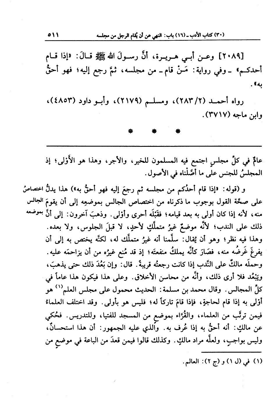 [2089] وعَن أَبِي هُرَيرَةَ: أَنَّ رَسُولَ اللَّهِ صَلَّى اللَّهُ عَلَيهِ وَسَلَّمَ قَالَ: إِذَا قَامَ أَحَدُكُم، وفي رواية: مَن قَامَ مِن مَجلِسِهِ ثُمَّ رَجَعَ إِلَيهِ، فَهُوَ أَحَقُّ بِهِ.