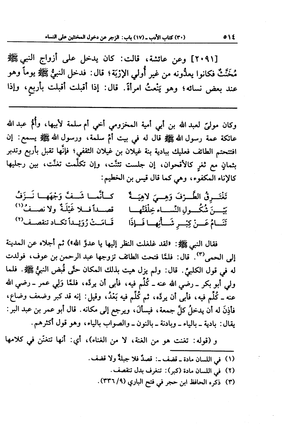 [2091] وعَن عَائِشَةَ قَالَت: كَانَ يَدخُلُ عَلَى أَزوَاجِ النَّبِيِّ صَلَّى اللَّهُ عَلَيهِ وَسَلَّمَ مُخَنَّثٌ، فَكَانُوا يَعُدُّونَهُ مِن غَيرِ أُولِي الإِربَةِ، قَالَ: فَدَخَلَ النَّبِيُّ صَلَّى اللَّهُ عَلَيهِ وَسَلَّمَ يَومًا، وَهُوَ عِندَ بَعضِ نِسَائِهِ، وَهُوَ يَنعَتُ امرَأَةً، قَالَ: إِذَا أَقبَلَت أَقبَلَت بِأَربَعٍ، وَإِذَا