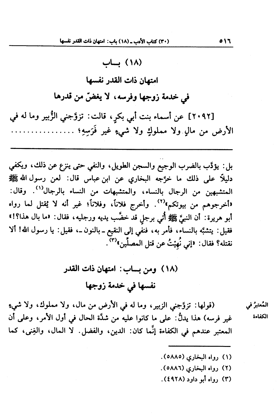 (18) باب امتهان ذات القدر نفسها في خدمة زوجها وفرسه؛ لا يغض من قدرها