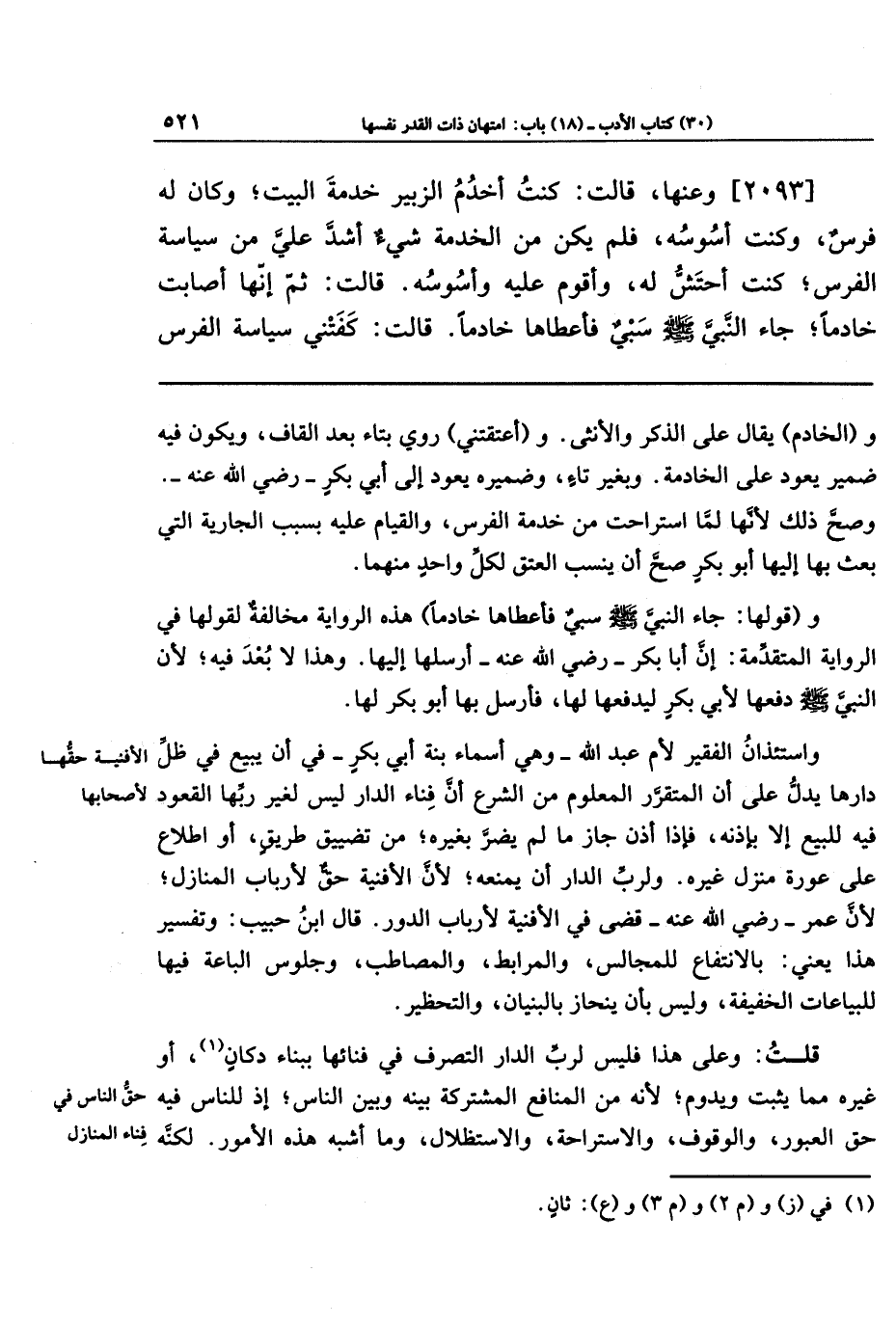 [2093] وعنها قَالَت: كُنتُ أَخدُمُ الزُّبَيرَ خِدمَةَ البَيتِ، وَكَانَ لَهُ فَرَسٌ، وَكُنتُ أَسُوسُهُ، فَلَم يَكُن مِن الخِدمَةِ شَيءٌ أَشَدَّ عَلَيَّ مِن سِيَاسَةِ الفَرَسِ، كُنتُ أَحتَشُّ لَهُ، وَأَقُومُ عَلَيهِ وَأَسُوسُهُ، قَالَت: ثُمَّ إِنَّهَا أَصَابَت خَادِمًا، جَاءَ النَّبِيَّ صَلَّى اللَّهُ عَلَيهِ وَسَلَّمَ سَبيٌ فَأَعطَاهَا خَادِمًا، قَالَت: كَفَتنِي سِيَاسَةَ الفَرَسِ،
