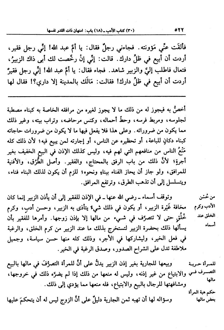 وبيعها للجارية بغير إذن الزبير يدلّ على أن للمرأة التصرُّف في مالها بالبيع والابتياع من غير إذنه، وليس له منعها من ذلك إذا لم يضرُّه ذلك في خروجها، ومشافهتها للرجال بالبيع والابتياع، فله منعها مما يؤدي إلى ذلك.