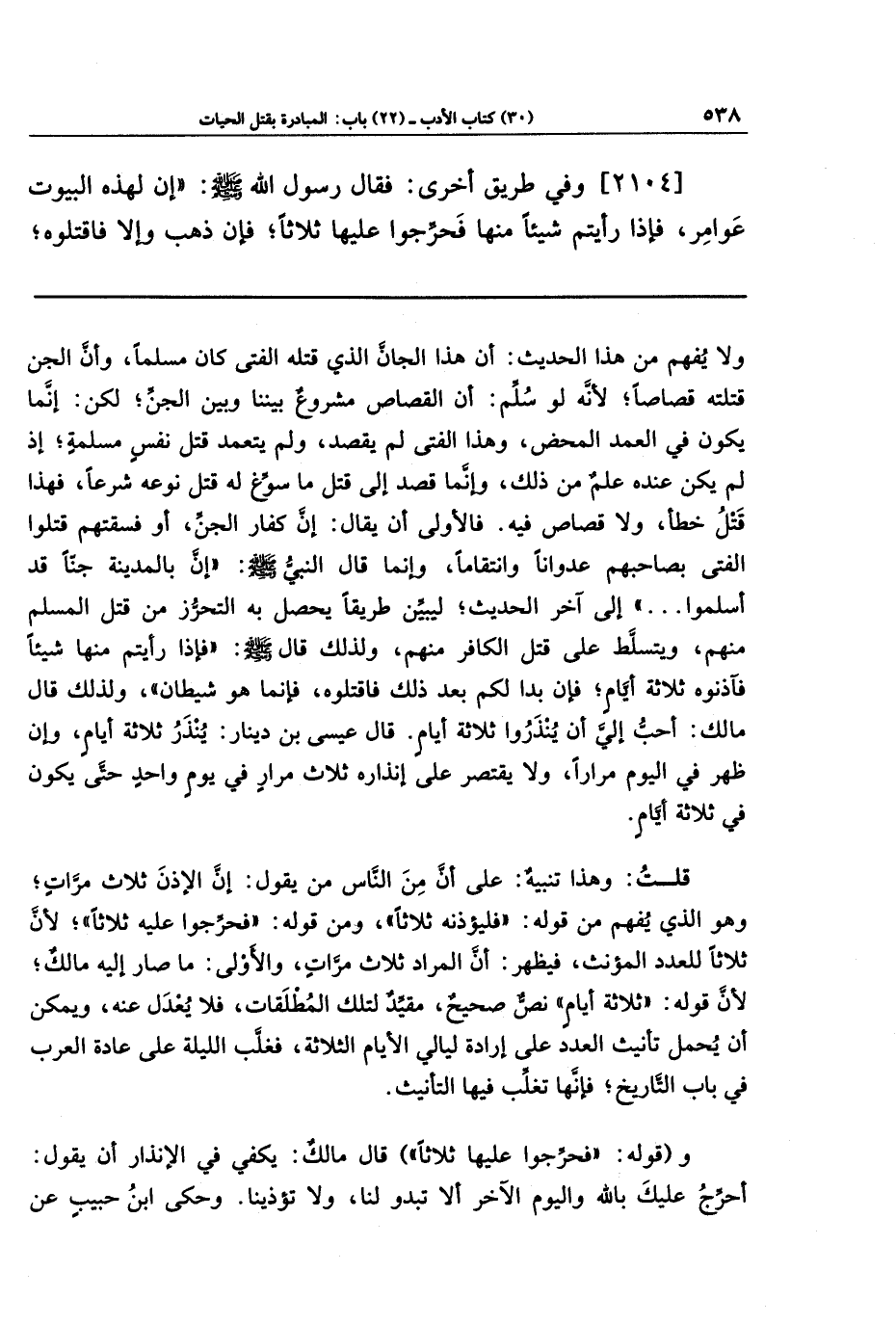 ولا يفهم من هذا الحديث: أن هذا الجان الذي قتله الفتى كان مسلمًا، وأن الجنَّ قتلته قصاصًا؛ لأنَّه لو سلم: أن القصاص مشروع بيننا وبين الجن، لكن: إنما يكون في العمد المحض، وهذا الفتى لم يقصد، ولم يتعمد قتل نفس مسلمة؛ إذ لم يكن عنده علم من ذلك، وإنما قصد إلى قتل ما سوَّغ له قتل نوعه شرعًا، فهذا قتل خطأ، ولا قصاص فيه. فالأولى أن يقال: إن كفار الجن أو فسقتهم قتلوا الفتى بصاحبهم عدوانًا وانتقامًا، وإنما قال النبي - صلى الله عليه وسلم -: (إن بالمدينة جنًّا قد أسلموا. . .) إلى آخر الحديث؛ ليبين طريقًا يحصل به التحرُّز من قتل المسلم منهم، ويتسلط به على قتل الكافر منهم، ولذلك قال صلى الله عليه وسلم: (فإذا رأيتم منها شيئًا فآذنوه ثلاثة أيام، فإن بدا لكم بعد ذلك فاقتلوه، فإنما هو شيطان) ولذلك قال مالك: أحبُّ إلي أن ينذروا ثلاثة أيام. قال عيسى بن دينار: ينذر ثلاثة أيام، وإن ظهر في اليوم مرارًا، ولا يقتصر على إنذاره ثلاث مرار في يوم واحد حتى يكون في ثلاثة أيام.