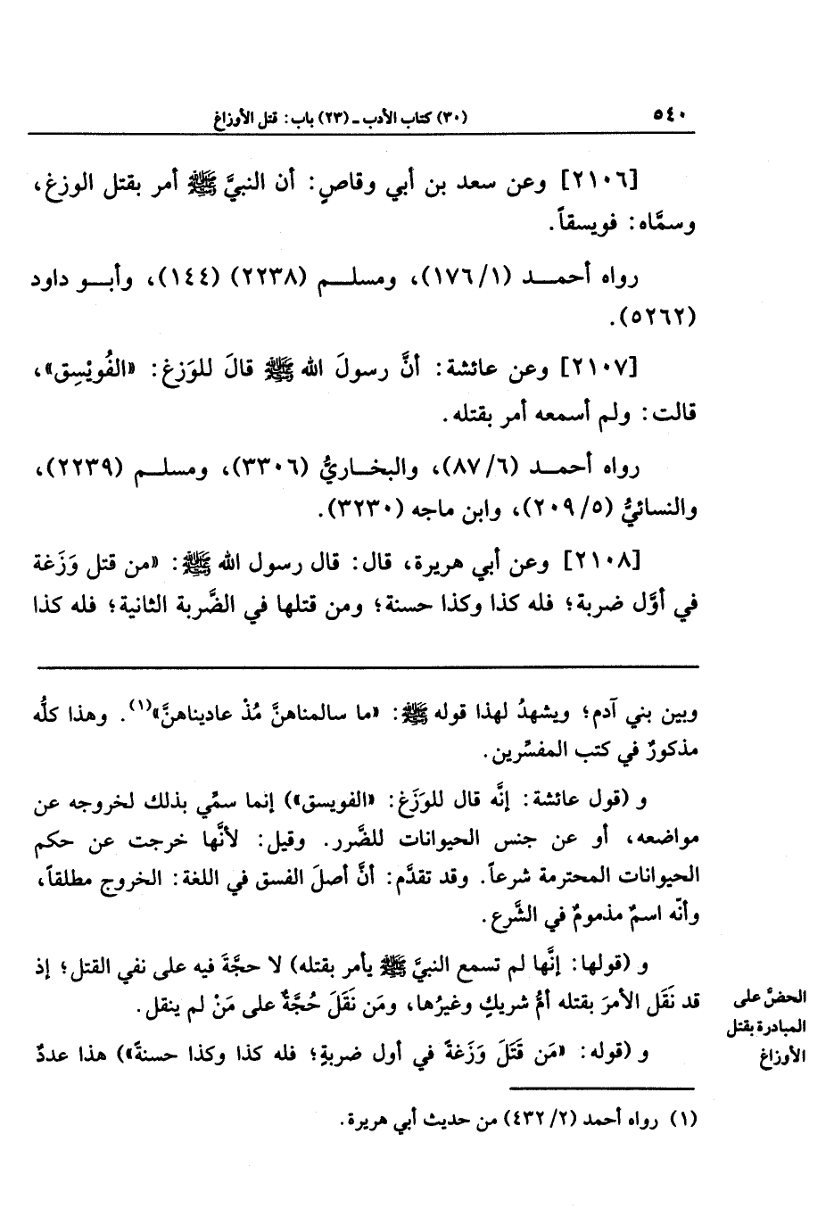 [2108] وعَن أَبِي هُرَيرَةَ قَالَ: قَالَ رَسُولُ اللَّهِ صَلَّى اللَّهُ عَلَيهِ وَسَلَّمَ: مَن قَتَلَ وَزَغَةً فِي أَوَّلِ ضَربَةٍ فَلَهُ كَذَا وَكَذَا حَسَنَةً، وَمَن قَتَلَهَا فِي الضَّربَةِ الثَّانِيَةِ فَلَهُ كَذَا