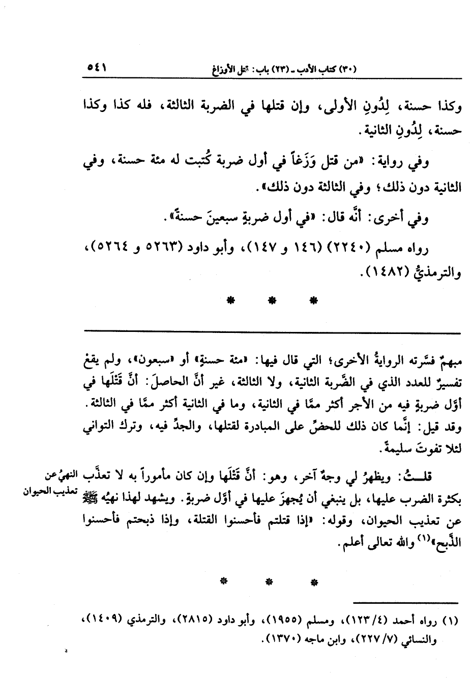قلت: ويظهر لي وجه آخر، وهو: أن قتلها وإن كان مأمورًا به لا تعذب بكثرة الضرب عليها، بل ينبغي أن يجهز عليها في أوَّل ضربة. ويشهد لهذا نهيه - صلى الله عليه وسلم - عن تعذيب الحيوان، و (قوله: إذا قتلتم فأحسنوا القتلة، وإذا ذبحتم فأحسنوا الذبح) (¬1) والله تعالى أعلم.