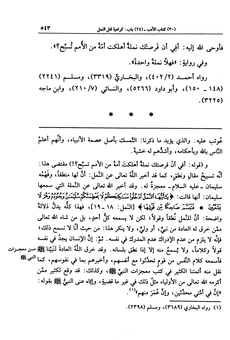 و(قوله: أفي أن قرصتك نملةٌ أهلكتَ أمةً من الأمم تسبح؟ ) مقتضى هذا: أنه تسبيحُ مقالٍ ونطق، كما قد أخبر الله تعالى عن النَّمل: أنَّ لها منطقًا، وفَهمُه سليمان - عليه السلام - معجزة له. وقد أخبر الله تعالى عن النملة التي سمعها سليمان: أنها قالت: {يَا أَيُّهَا النَّملُ ادخُلُوا مَسَاكِنَكُم لا يَحطِمَنَّكُم سُلَيمَانُ وَجُنُودُهُ وَهُم لا يَشعُرُونَ * فَتَبَسَّمَ ضَاحِكًا مِن قَولِهَا} فهذا كلُّه يدلُّ دَلالةً واضحة: أن للنَّمل نُطقًا وقولًا، لكن لا يسمعه كل أحدٍ، بل من شاء الله تعالى مِمَّن خرق له العادة من نبي، أو ولي، ولا ينكر هذا من حيث أنَّا لا نسمع ذلك، فإنَّه لا يلزم من عدم الإدراك عدم المدرك في نفسه. ثم: إن الإنسان يجدُ في نفسه قولًا وكلامًا، ولا يُسمعُ منه إلا إذا نطق بلسانه. وقد خرق الله العادةَ لنَبيِّنا - صلى الله عليه وسلم - فأسمعه كلام النفس من قومٍ تحدَّثوا مع أنفسهم، وأخبرهم بما في نفوسهم، كما نقل منه أئمتنا الكثير في كتب معجزات النبي - صلى الله عليه وسلم -، وكذلك: قد وقع لكثير مِمَّن أكرمه الله تعالى من الأولياء مثلُ ذلك في غير ما قضيةٍ، وإيَّاه عنى النبي - صلى الله عليه وسلم - بقوله: (إن في أمَّتي محدَّثين، وإنَّ عُمَرَ منهم) (¬1).