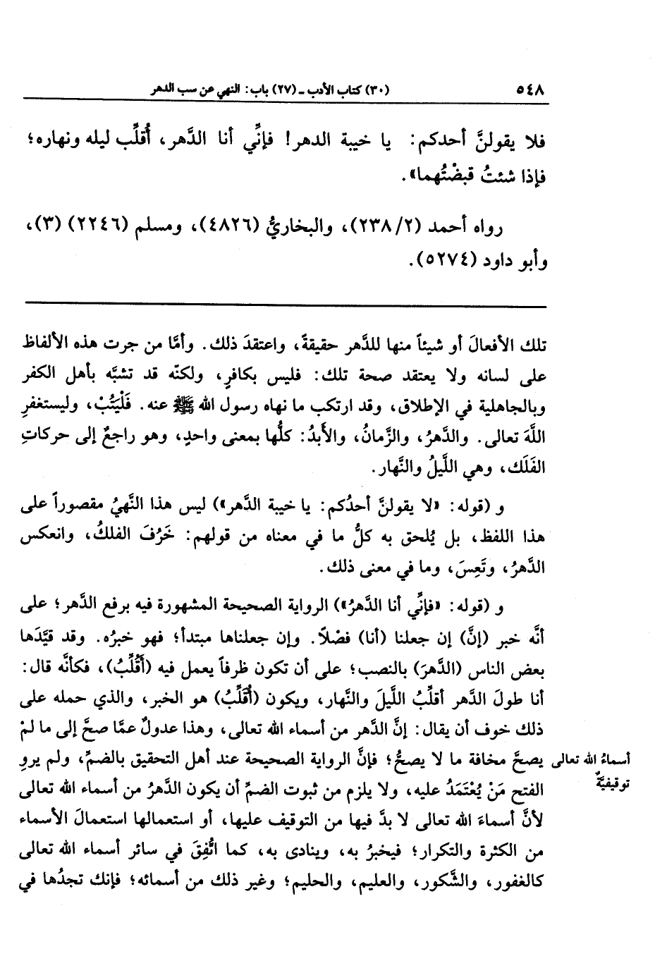 فَلَا يَقُولَنَّ أَحَدُكُم يَا خَيبَةَ الدَّهرِ؛ فَإِنِّي أَنَا الدَّهرُ، أُقَلِّبُ لَيلَهُ وَنَهَارَهُ، فَإِذَا شِئتُ قَبَضتُهُمَا.