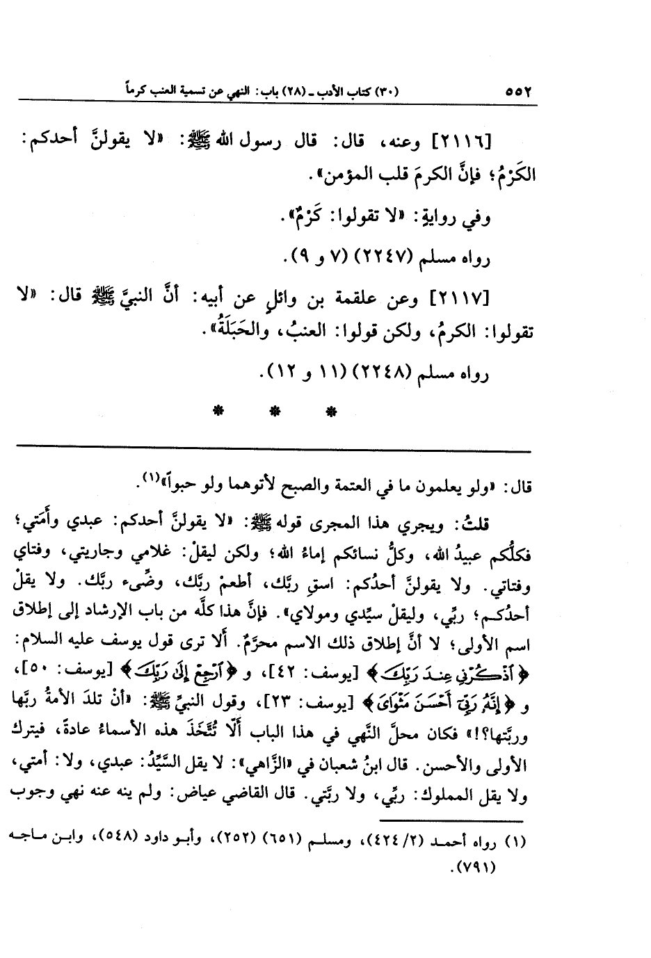 قلت: ويجري هذا المجرى قوله - صلى الله عليه وسلم -: (لا يقولن أحدكم: عبدي وأمتي، فكلكم عبيد الله، وكلُّ نسائكم إماء الله، ولكن ليقل: غلامي وجاريتي، وفتاي وفتاتي. ولا يقولنَّ أحدكم: اسق ربَّك، أطعم ربَّك، وضئ ربّك، ولا يقل أحدكم: ربِّي، وليقل سيدي ومولاي) فإنَّ هذا كله من باب الإرشاد إلى إطلاق اسم الأولى؛ لا أن إطلاق ذلك الاسم محرَّم. ألا ترى قول يوسف - عليه السلام -: {اذكُرنِي عِندَ رَبِّكَ} و {ارجِع إِلَى رَبِّكَ} و {إِنَّهُ رَبِّي أَحسَنَ مَثوَايَ} وقول النبي - صلى الله عليه وسلم -: (أن تلد الأمة ربَّها وربَّتها)؟ ! فكان محل النهي في هذا الباب ألا تُتَّخذ هذه الأسماء عادة، فيترك الأولى والأحسن. قال ابن شعبان في الزاهي: لا يقل السَّيد: عبدي، ولا: أمتي، ولا يقل المملوك: ربِّي، ولا ربَّتي. قال القاضي عياض: ولم ينه عنه نهي وجوبٍ