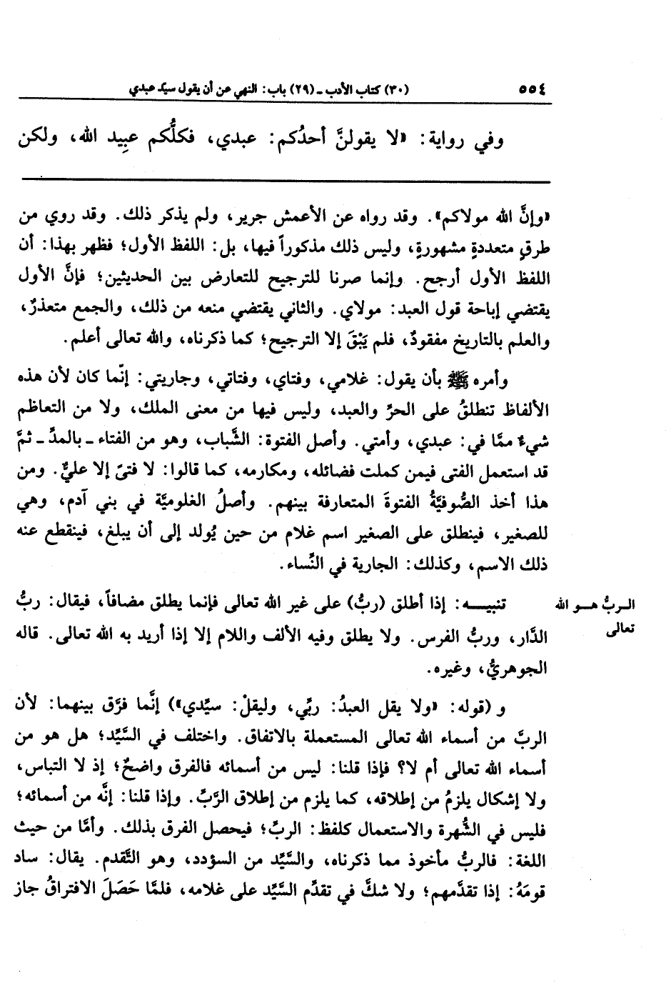 وفي رواية: لَا يَقُولَنَّ أَحَدُكُم عَبدِي، فَكُلُّكُم عَبِيدُ اللَّهِ، وَلَكِن