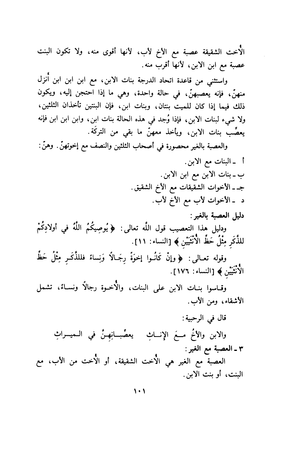الأخت الشقيقة عصبة مع الأخ لأب، لأنها أقوى منه، ولا تكون البنت عصبة مع من ابن الابن، لأنها أقرب منه.
