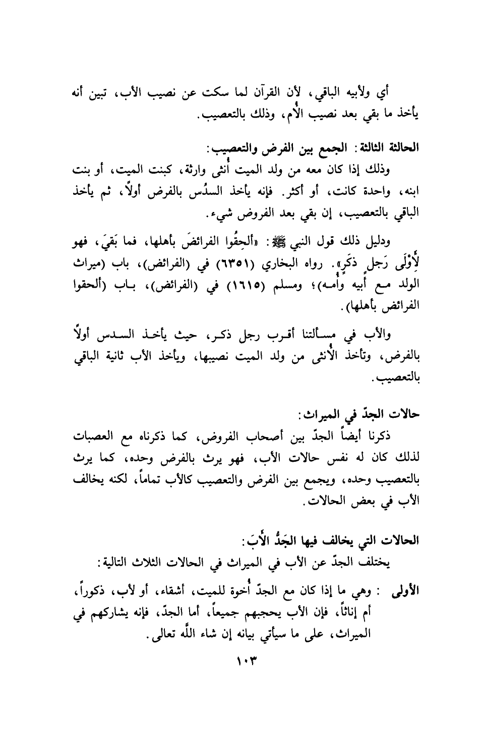 ذكرنا أيضاً الجد بين أصحاب الفروض، كما ذكرناه مع العصبات لذلك كان له نفس حالات الأب، فهو يرث بالفرض وحده، كما يرث بالتعصيب وحده، ويجمع بين الفرض والتعصيب كالأب تماماً، لكنه يخالف الأب في بعض الحالات.