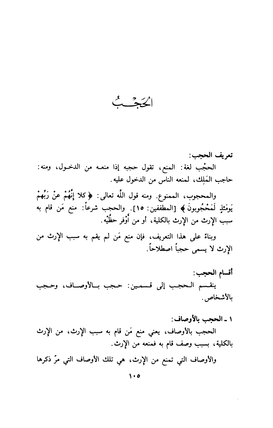 الحجب بالأوصاف، ويعني منع من قام به سبب الإرث، من الإرث بالكلية، بسبب وصف قام به فمنعه من الإرث.