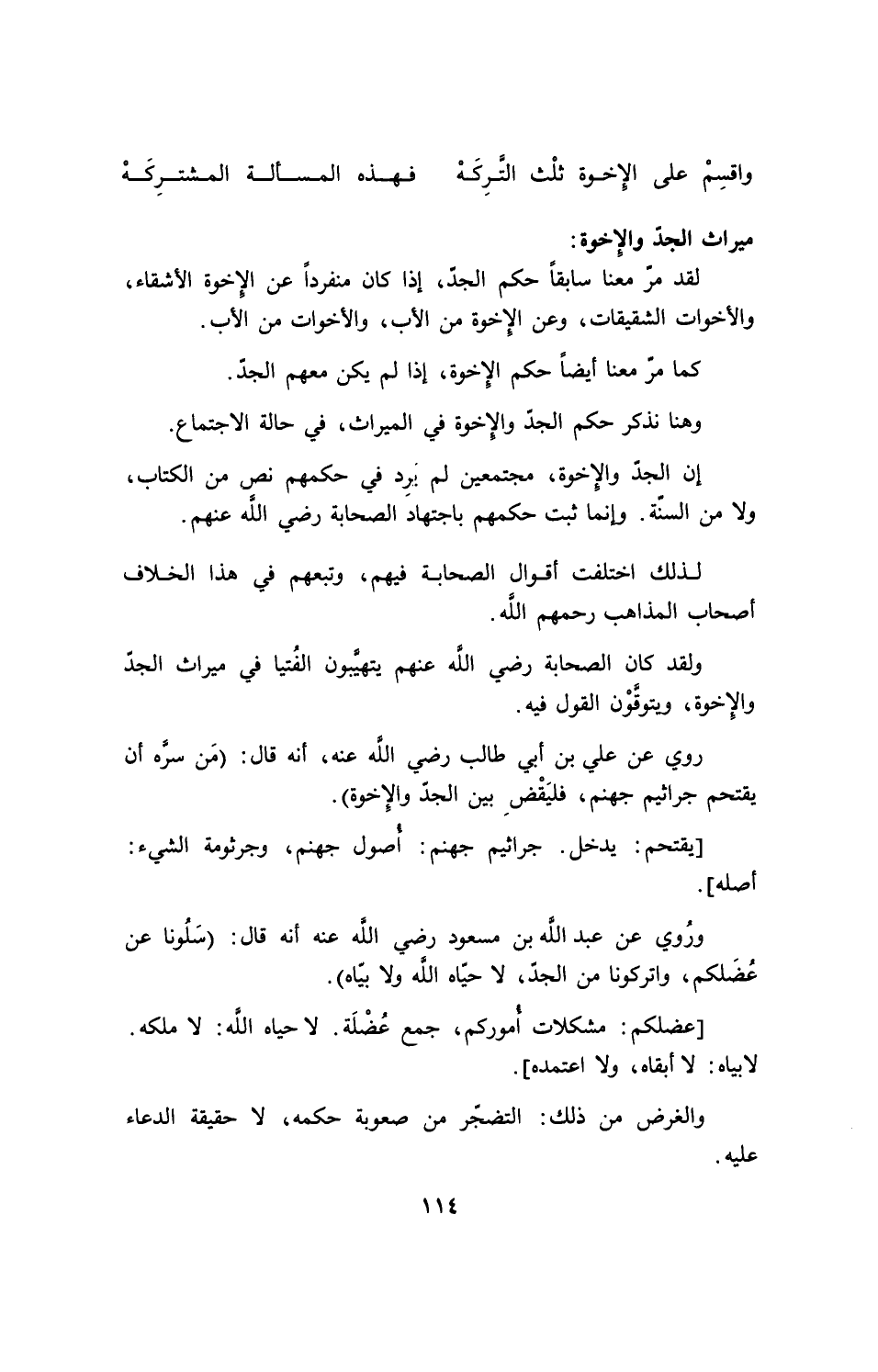 روي عن علي بن أبي طالب رضي الله عنه، أنه قال: (من سره أن يقتحم جراثيم جهنم، فليقض بين الجد والإخوة).