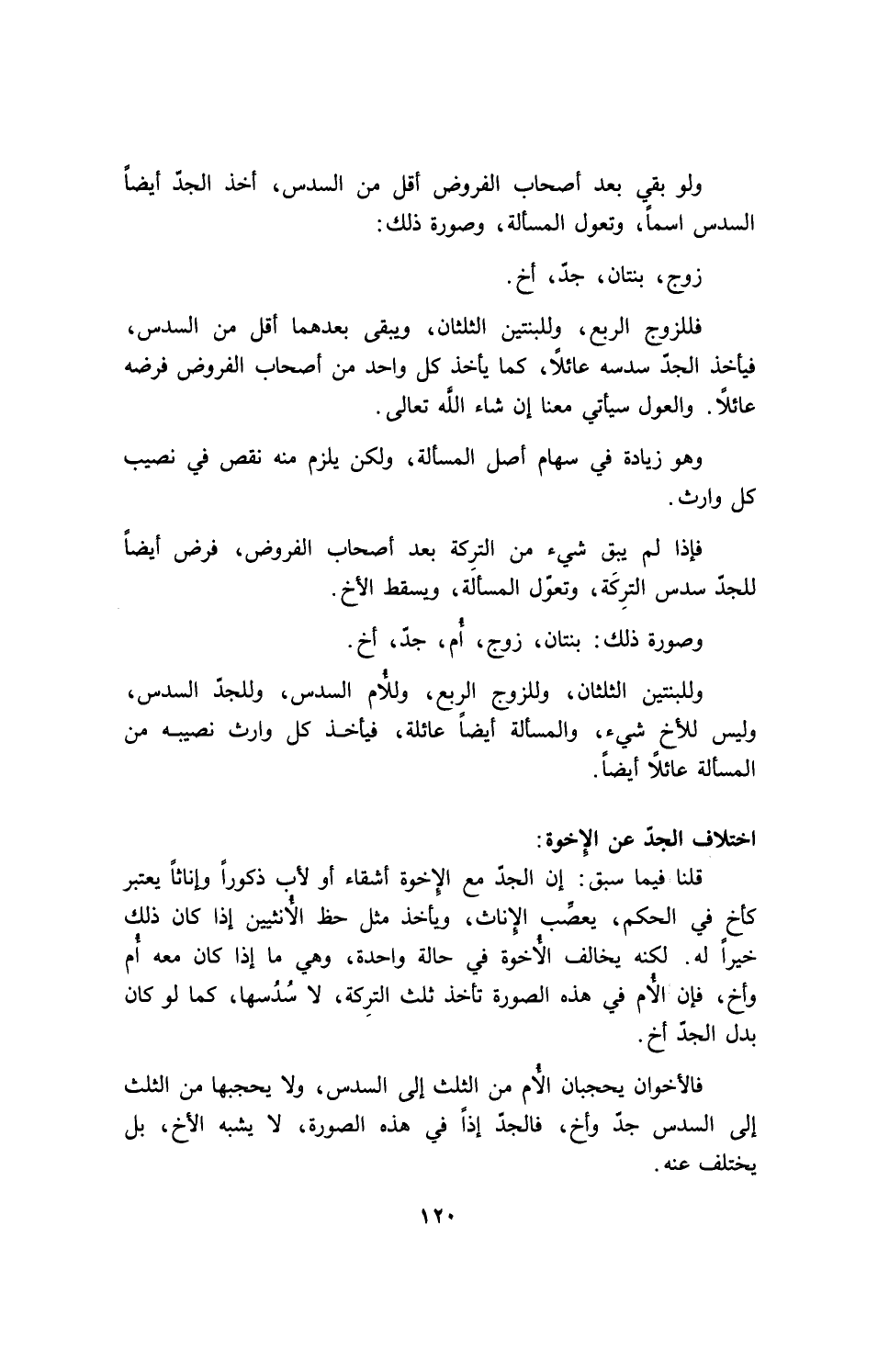 فإذا لم يبق شئ من التركة بعد أصحاب الفروض، فرض أيضاً للجد سدس التركة، وتعول المسألة، ويسقط الأخ.