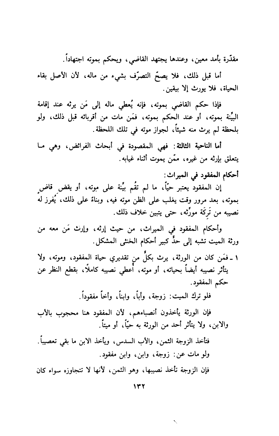 1 - فمن كان من الورثة، يرث بكل من تقديري حياة المفقود، وموته، ولا يتأثر نصيبه أيضاً بحياته، أو موته، أعطى نصيبه كاملاً، بقطع النظر عن حكم المفقود.