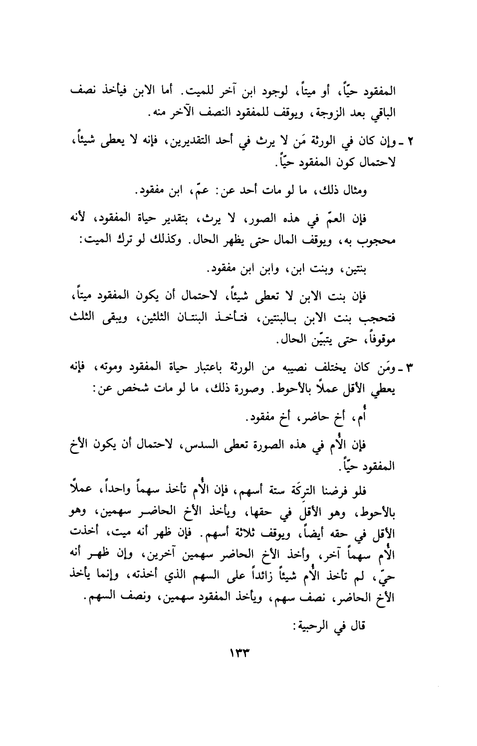 2 - وإن كان في الورثة من لا يرث في أحد التقديرين، فإنه لا يعطى شيئاً، لاحتمال كون المفقود حياً.