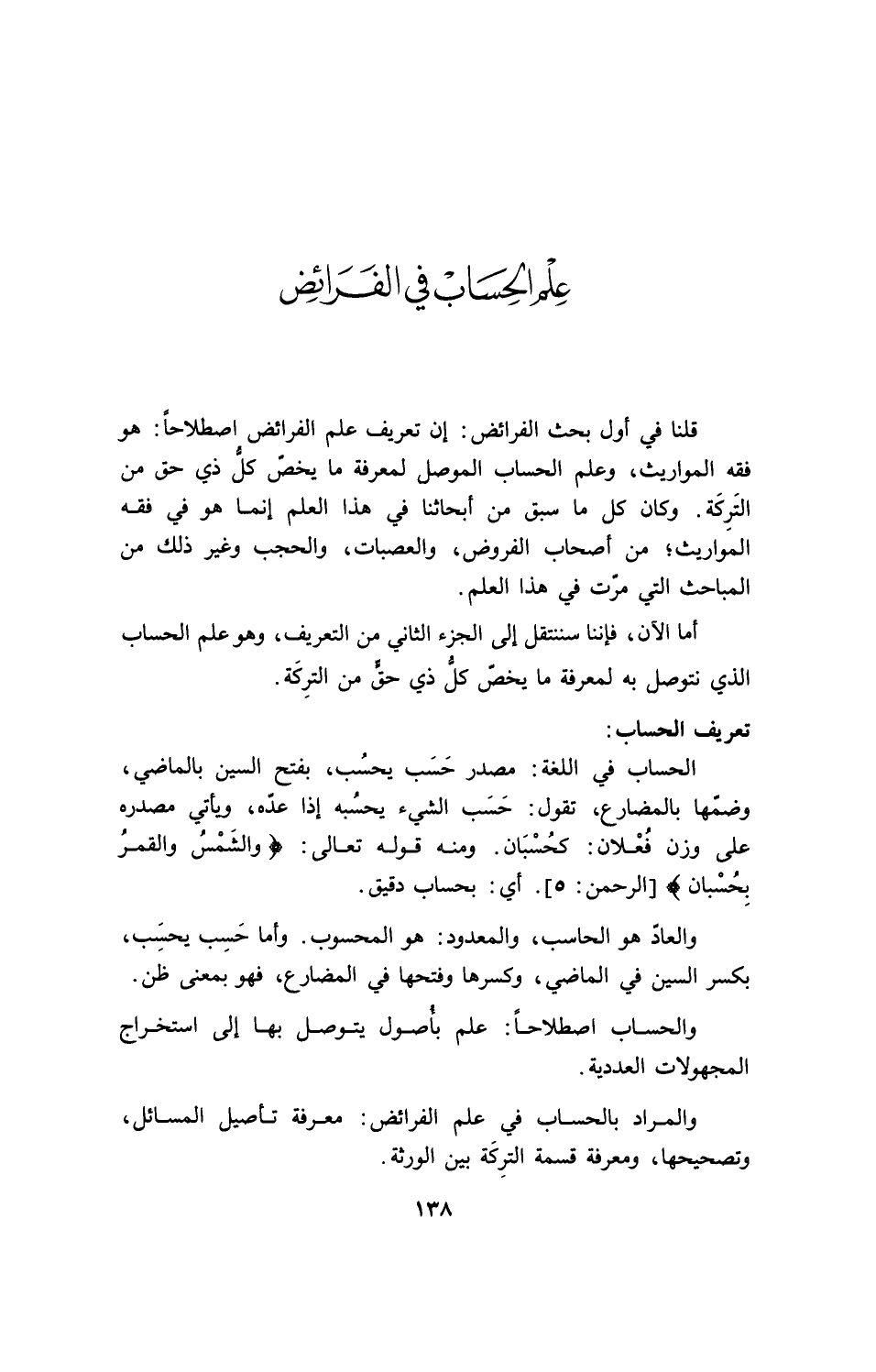 أما الآن، فإننا سننتقل إلى الجزء الثاني من التعريف، وعلم الحساب الذي نتوصل به لمعرفة ما يخص كل ذي حق من التركة.