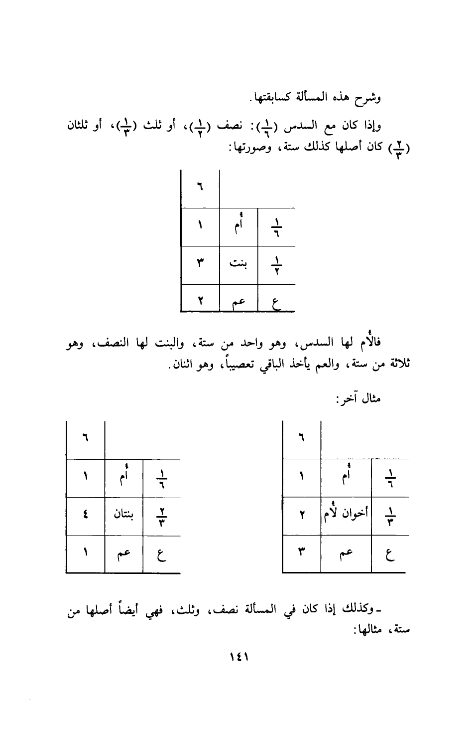 وإذا كان مع السدس (6/ 1): نصف (2/ 1)، أو ثلث (3/ 1)، أو ثلثان (3/ 2) كان أصلها كذلك ستة، وصورتها: