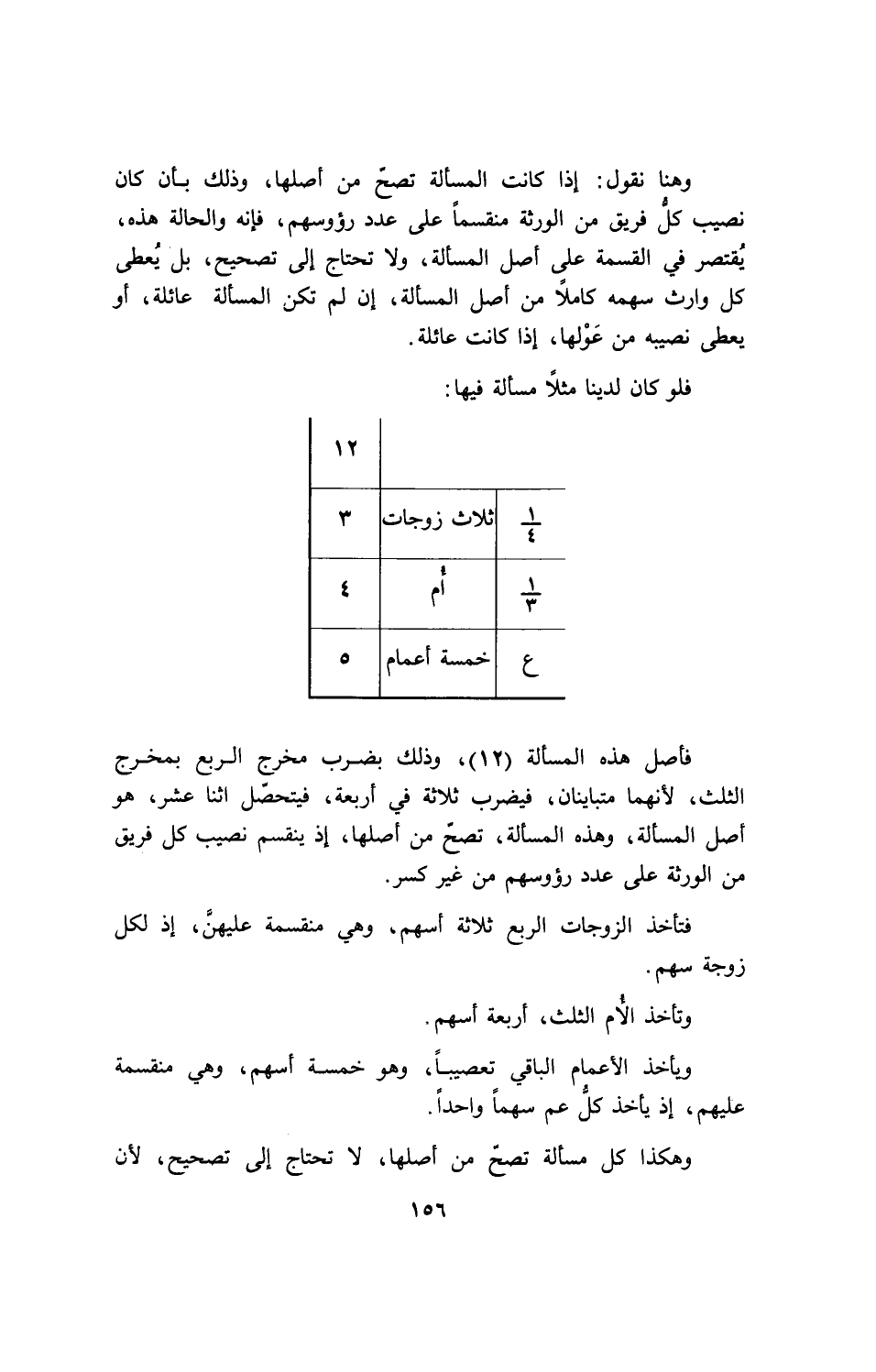 فأصل هذه المسألة (12)، وذلك بضرب مخرج الربع بمخرج الثلث، لأنهما متباينان، فيضرب ثلاثة في أربعة، فيتحصل اثنا عشر، هو أصل المسألة، وهذه المسألة، تصح من أصلها، إذ ينقسم نصيب كل فريق من الورثة على عدد رؤوسهم من غير كسر.