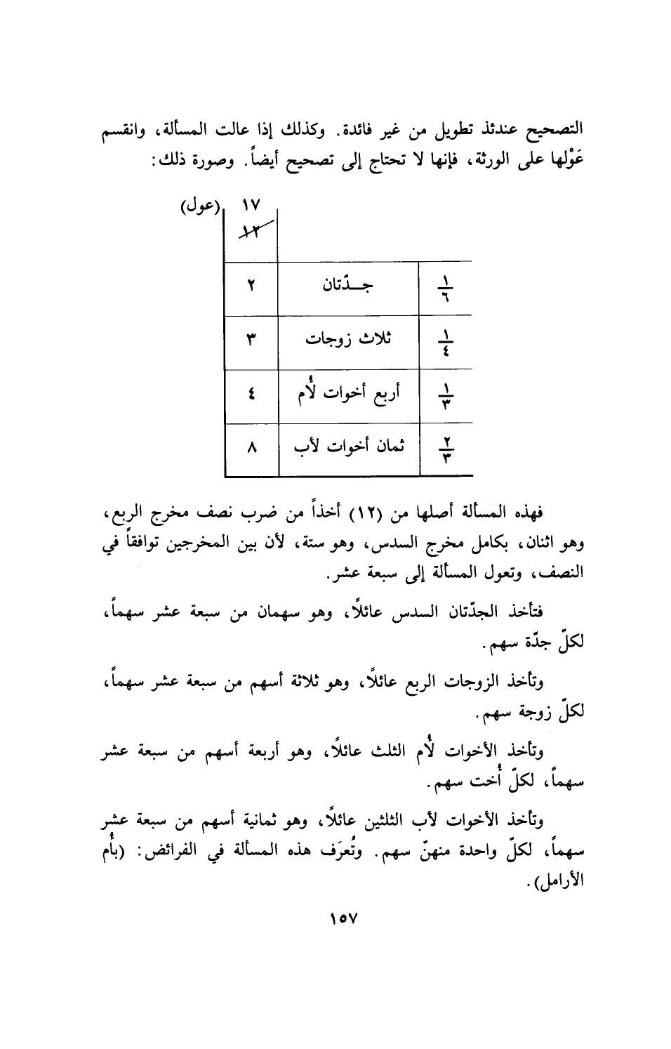 فهذه المسألة أصلها من (12) أخذاً من ضرب نصف مخرج الربع، وهو اثنان، بكامل مخرج السدس، وهو ستة، لأن بين المخرجين توافقاً في النصف، وتعول المسألة إلى سبعة عشر.
