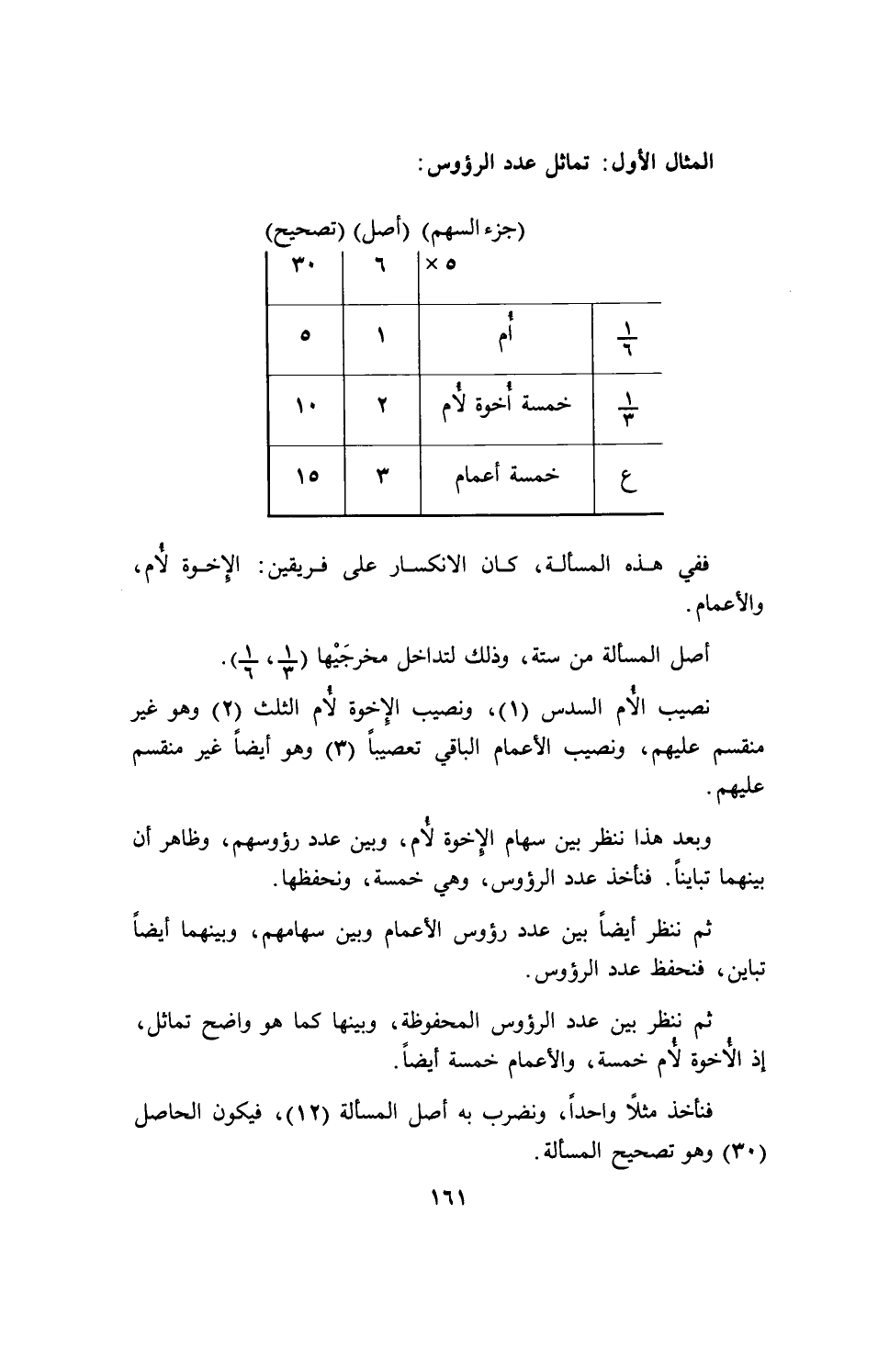 وبعد هذا ننظر بين سهام الإخوة لأم، وبين عدد رؤوسهم، وظاهر أن بينهما تبايناً. فنأخذ عدد الرؤوس، وهي خمسة، ونحفظها.