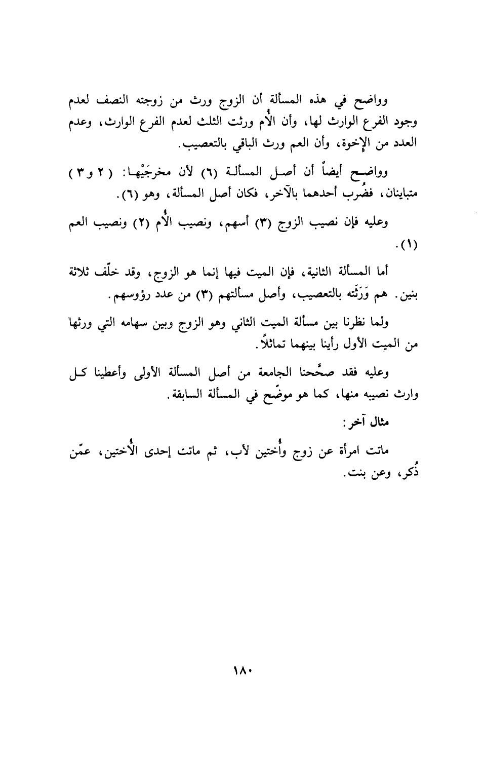 وواضح أيضاً أن أصل المسألة (6) لأن مخرجيها: (2و3) متباينان، فضرب أحدهما بالآخر، فكان أصل المسألة، وهو (6).