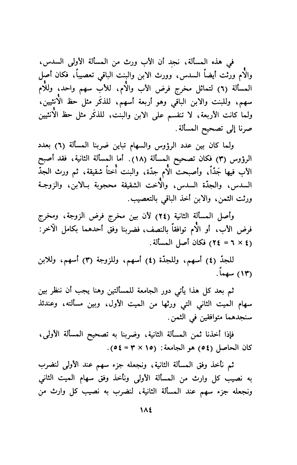 ولما كان بين عدد الرؤوس والسهام تباين المسألة (6) بعدد الرؤوس (3) فكان تصحيح المسألة (18). أما المسألة الثانية، فقد أصبح الأب فيها جداً، وأصبحت الأم جدة، والبنت أختاً شقيقة، ثم ورث الجد السدس، والجدة السدس، والأخت الشقيقة محجوبة بالابن، والزوجة ورثت الثمن، والابن أخذ الباقي بالتعصيب.