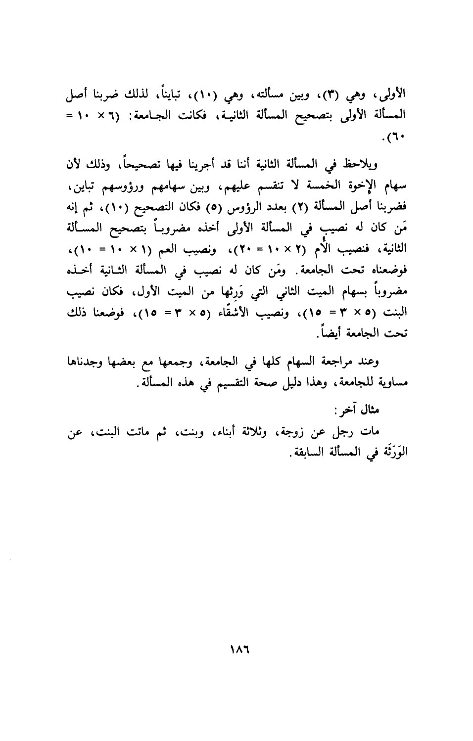 الأولى، وهي (3) وبين مسألته، وهي (10)، تبايناً، لذلك ضربنا أصل المسألة الأولى بتصحيح المسألة الثانية، فكانت الجامعة: (6×10=60).