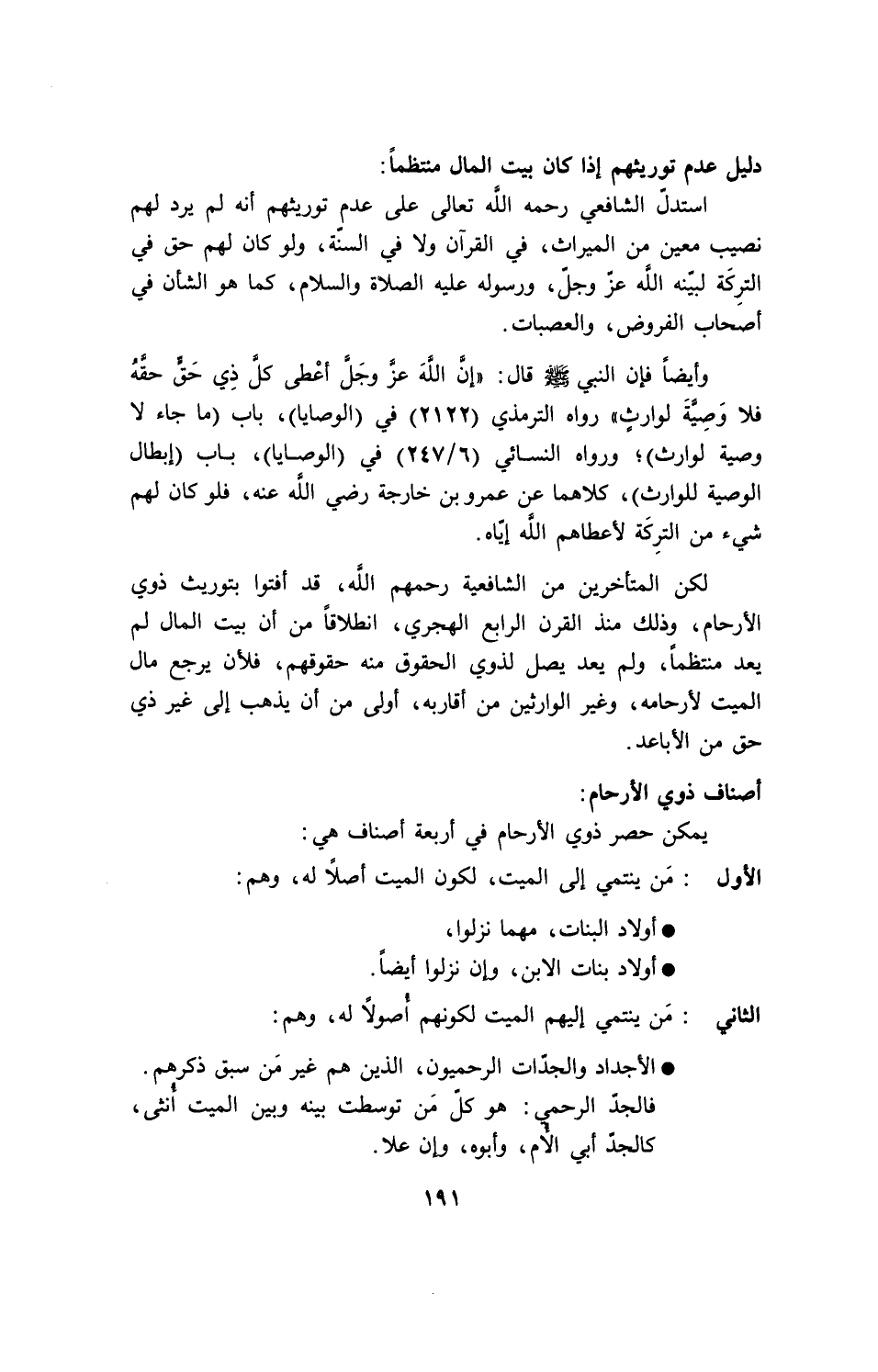 لكن المتأخرين من الشافعية رحمهم الله، قد أفتوا بتوريث ذويي الأرحام، وذلك منذ القرن الرابع الهجري، انطلاقاً من أن بيت المال لم يعد منتظماً، ولم يعد يصل لذوي الحقوق منه حقوقهم، فلأن يرجع مال الميت لأرحامه، وغير الوارثين من أقاربه، أولى من أن يذهب إلى غير ذي حق من الأباعد.
