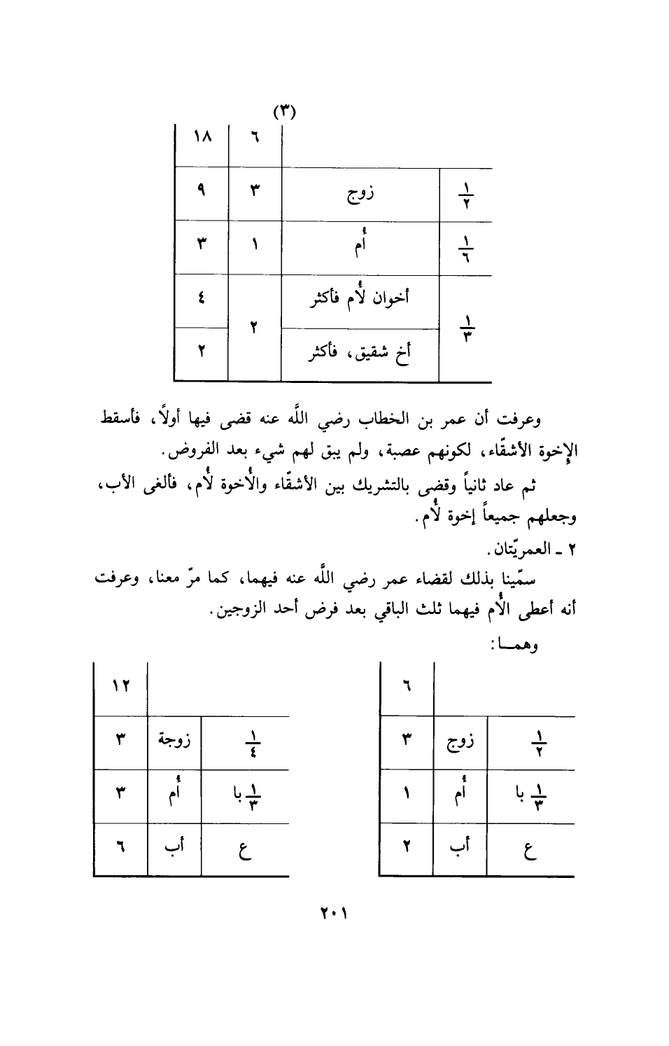 وعرفت أن عمر بن الخطاب - رضي الله عنه - قضى فيها أولاً، فأسقط الإخوة الأشقاء، لكونهم عصبة، ولم يبق لهم شيء بعد الفروض.