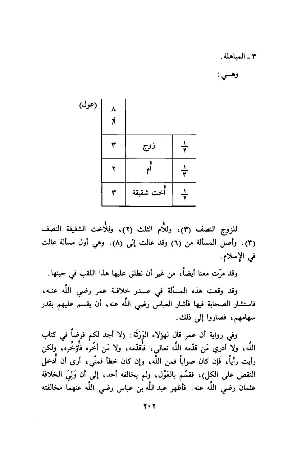 للزوج النصف (3) وللأم الثلث (2)، وللأخت الشقيقة النصف (3). وأصل المسألة من (6) وقد عالت إلى (8). وهي أول مسألة عالت في الإسلام.