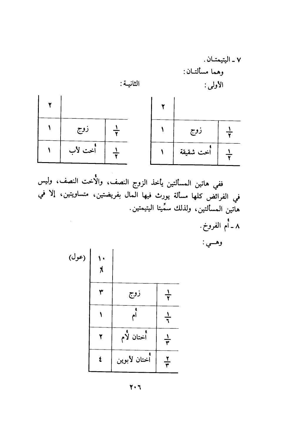 ففي هاتين المسألتين يأخذ الزوج النصف، والأخت النصف، وليس في الفرائض كلها مسألة يورث فيها المال بفريضتين، متساويتين، إلا في هاتين المسألتين، ولذلك سميتا اليتيمتين.