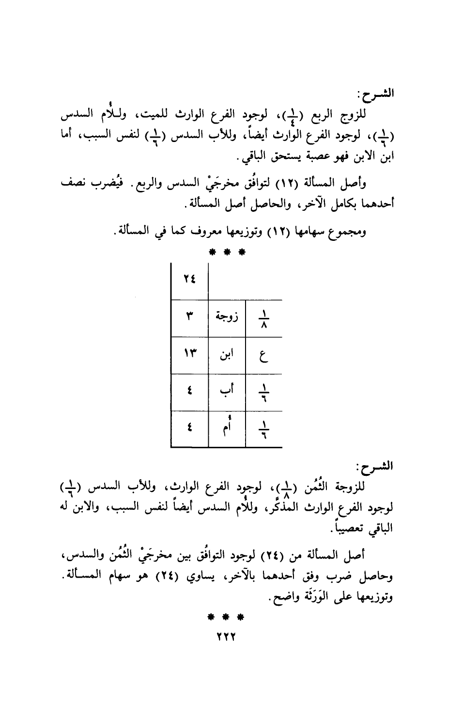وأصل المسألة (12) لتوافق مخرجي السدس والربع. فيضرب نصف أحدهما بكامل الآخر، والحاصل أصل المسألة. ومجموع سهامها (12) وتوزيعها معروف كما في المسألة.