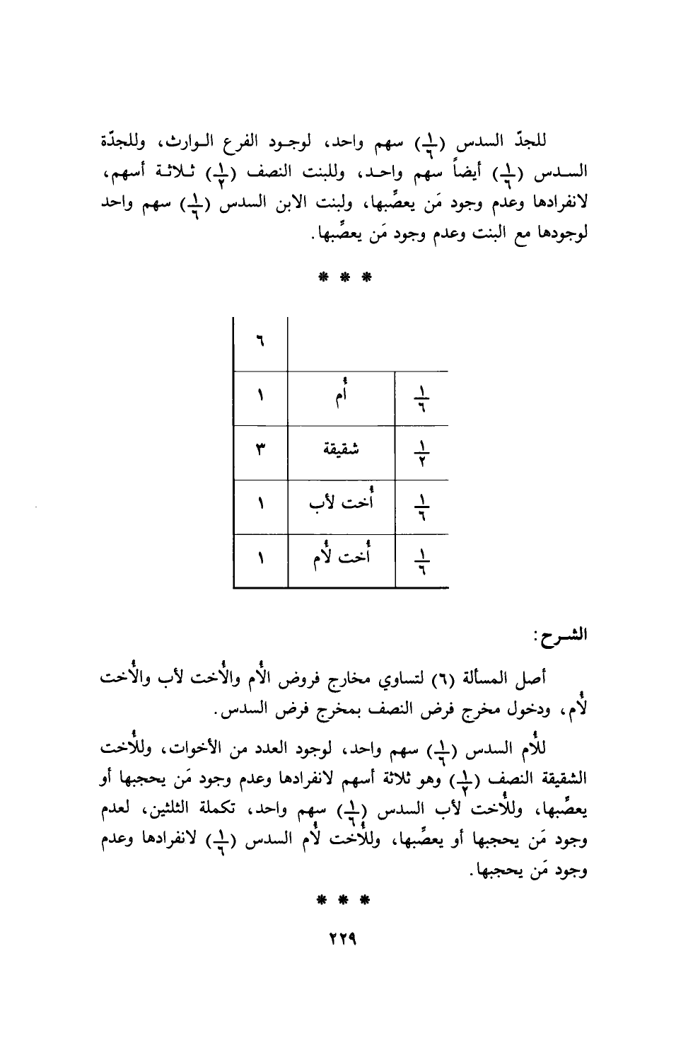للأم السدس (6/ 1) سهم واحد، لوجود العدد من الأخوات، وللأخت الشقيقة النصف (2/ 1) وهو ثلاثة أسهم لانفرادها وعدم وجود من يحجبها أو يعصبها، وللأخت لأب السدس (6/ 1) سهم واحد، تكملة الثلثين، لعدم وجود من يحجبها أو يعصبها، وللأخت لأم السدس (6/ 1) لانفرادها وعدم وجود من يحجبها.