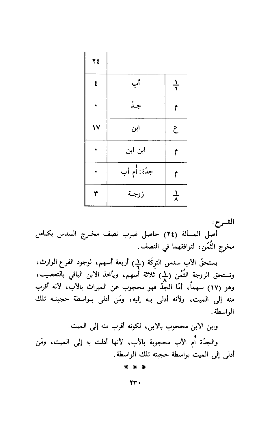 يستحق الأب سدس التركة (6/ 1) أربعة أسهم، لوجود الفرع الوارث، وتستحق الزوجة الثمن (8/ 1) ثلاثة أسهم، ويأخذ الابن الباقي بالتعصيب، وهو (17) سهماً، أما الجد فهو محجوب عن الميراث بالأب، لأنه أقرب منه إلى الميت، ولأنه أدلى به إليه ومن أدلى بواسطة حجبته تلك الواسطة.