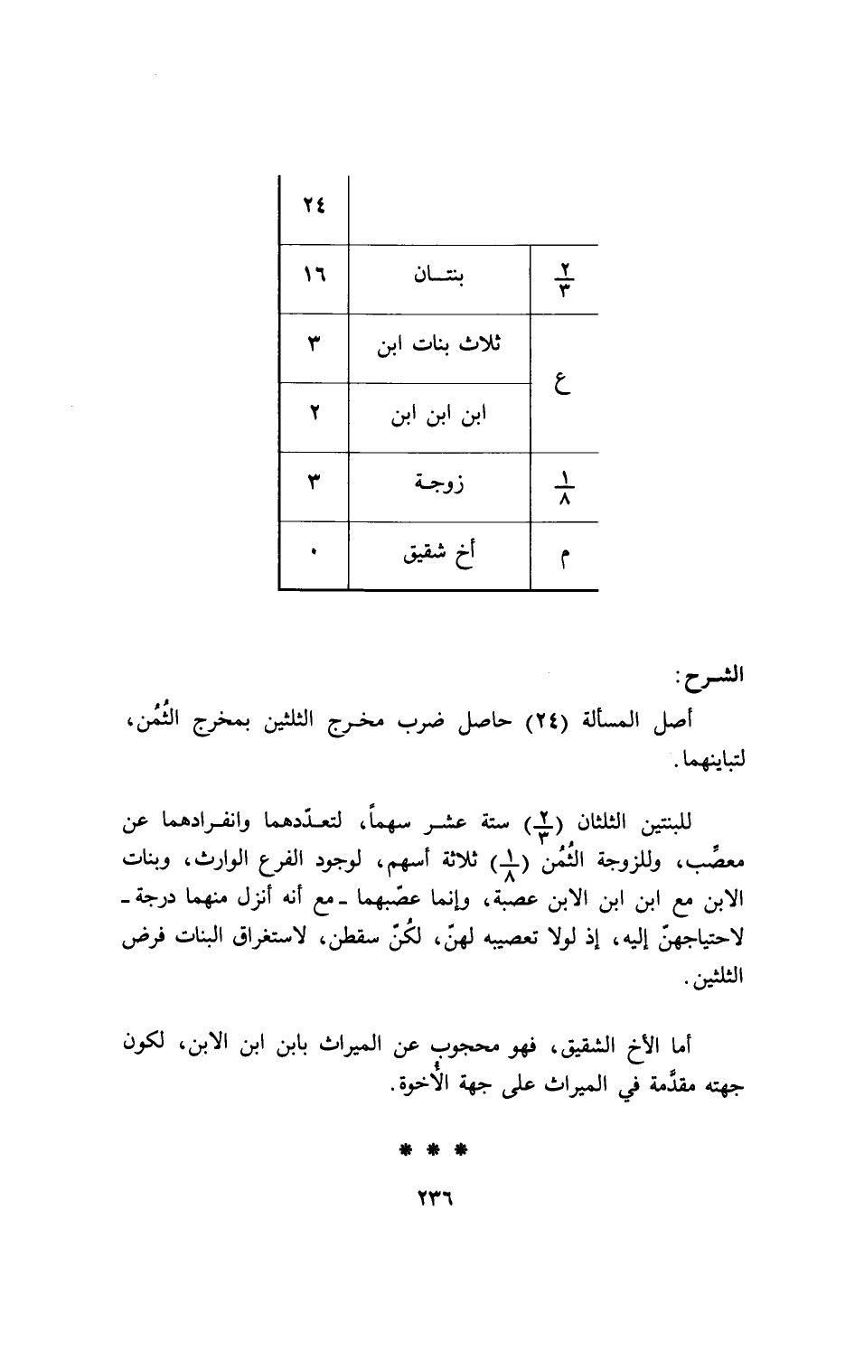 للبنتين الثلثان (3/ 2) ستة عشر سهماً، لتعددهما وانفرادهما عن معصب، وللزوجة الثمن (8/ 1) ثلاثة أسهم، لوجود الفرع الوارث، وبنات الابن مع ابن ابن الابن عصبة، وإنما عصبهما - مع انه أنزل منهما درجة- لاحتياجهن إليه، إذا لولا تعصيبه لهن، لكن سقطن، لاستغراق البنات فرض الثلثين.